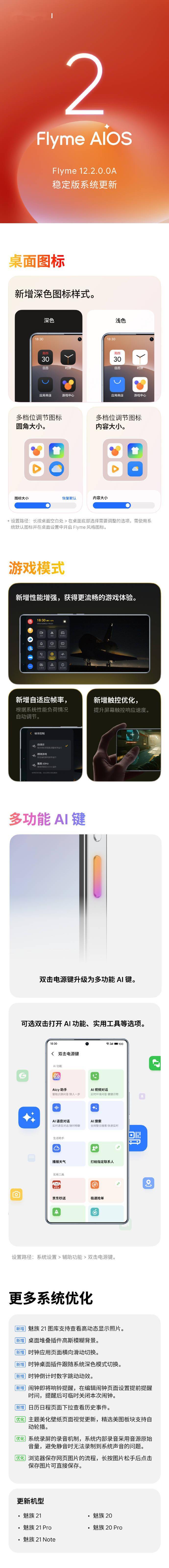 魅族今日公布 Flyme 12.2 稳定版系统更新,涵盖魅族 21、魅族 21 Pro、魅族 20、魅族 20 Pro、魅族 21 Note 等多款机型。 本次更新为桌面图标新增了深色样式,并且支持图标的圆角大小和内容大小调节,覆盖原生应用和绝大部分常用第三方应用。 双击电源键可唤醒 AI 实用功能等工具选项,更多操作更便捷、更直观。同时在时钟、日历、主题等系统工具及功能进行多项优化及调整。此外,游戏模式新增性能增强、自适应帧率和触控优化。 IT之家附更多系统优化: - 新增魅族 21 图库支持查看高动态显示照片。