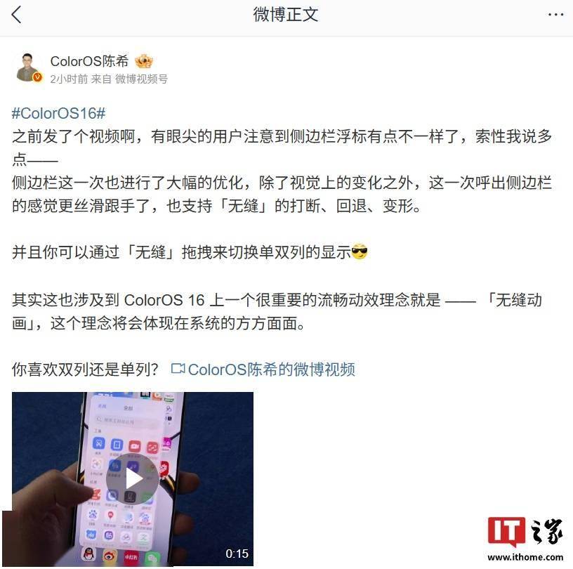OPPO ColorOS 设计总监陈希今日发布视频,透露了 ColorOS 16 系统的侧边栏优化情况。 据介绍,ColorOS 16 系统的侧边栏这一次进行了大幅的优化,除了视觉上的变化之外,这一次呼出侧边栏的感觉更丝滑跟手,支持「无缝」的打断、回退、变形,并且可以通过「无缝」拖拽来切换单双列的显示。 陈希透露称,ColorOS 16 系统引入了重要的流畅动效理念就是 —— 「无缝动画」,这个理念将会体现在系统的方方面面。 据IT之家此前报道,陈希本月早些时候宣布,ColorOS 16 将在今年的 10 月与大家如期见面。同时,ColorOS 15 的故事也没结束,九月的月更会继续优化上新。另外,ColorOS 的流体云将增加很多新场景,如歌曲收藏、B站视频上云、微博直播上云等“都在路上”。