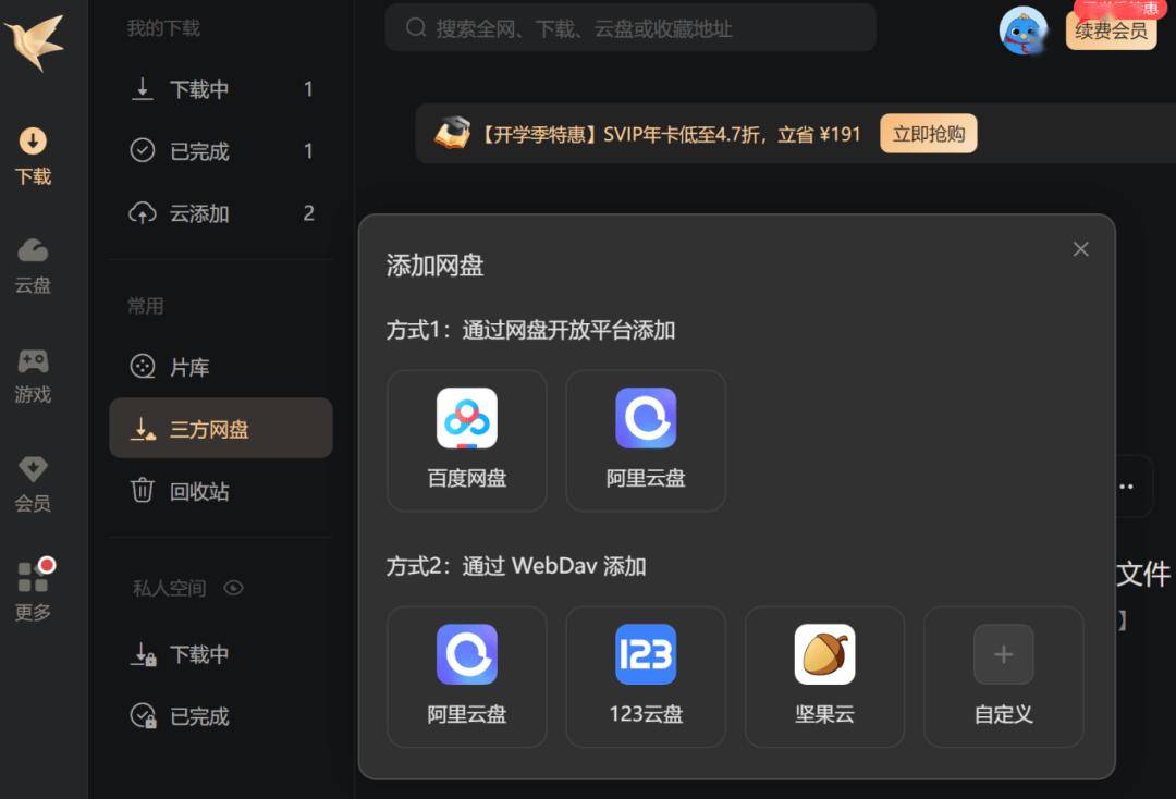 迅雷今日宣布 12.4.4 新版本上线,新增第三方网盘下载功能,面向所有用户免费开放。 迅雷官方表示,无需额外付费,用户完成第三方网盘授权后,即可在迅雷客户端内直接查看、下载所有资源;支持 MP4、MKV、MOV 等主流视频格式的原画云播,无需跳转其他播放器,即可实现“资源浏览 - 在线播放 - 本地下载”的无缝衔接。 IT之家注意到,为适配不同用户的存储习惯与使用场景,本次版本提供两种添加网盘的方式: 1、主流网盘直连:通过网盘开放平台,可直接添加百度网盘、阿里云盘等大众常用平台。用户需在迅雷客户端内完成官方授权,即可一键调用迅雷下载资源,无需反复切换多平台账号; 2、WebDav 协议挂载:支持基于 WebDav 通用网络协议的网盘接入,可适配自建存储、小众网盘等个性化场景,为有专属存储需求的进阶用户提供适配方案。