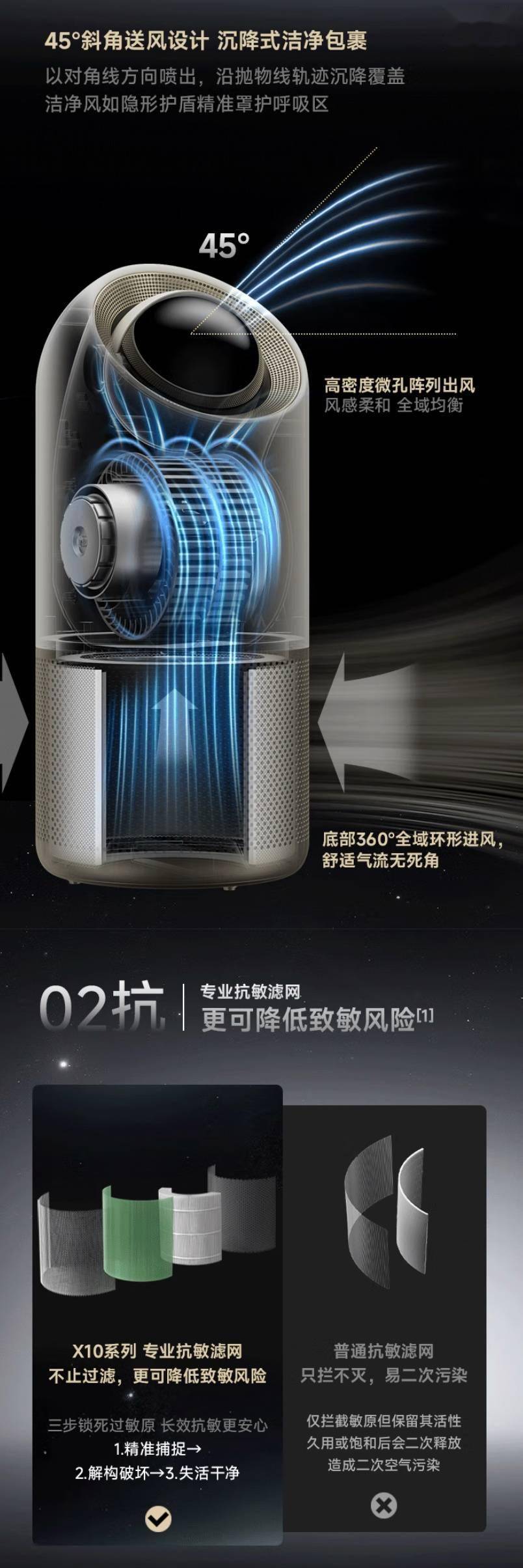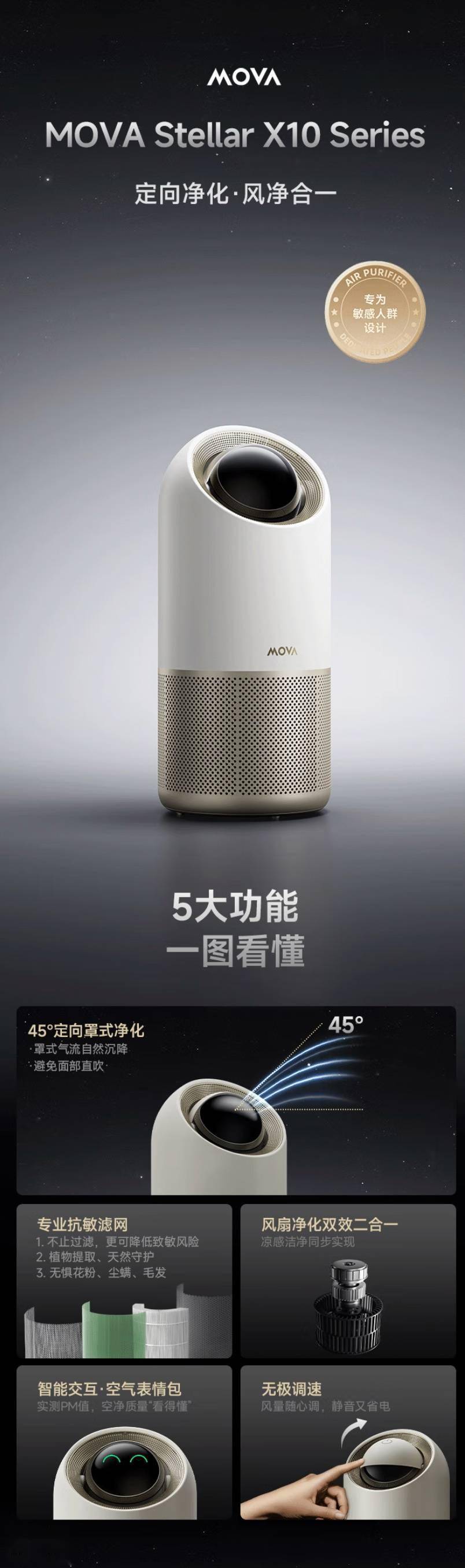 IT之家 9 月 8 日消息,MOVA 现已推出星空系列 Stellar X10 / Plus 空气净化器,主打“定向呼吸净化”技术,其中前者定价为 999 元,后者定价为 1199 元。 据介绍,系列空气净化器提供香槟金、新月银、星辰灰三种配色,搭载 45° 定向净化技术,号称可以控制气流以最舒适的角度覆盖用户面部,同时其搭载四层滤网,可过滤灰尘毛发、花粉螨虫、PM2.5、甲醛异味等。 系列空气净化器风力至高可达 6.4m/s,采用高性能直流无刷电机,运行声音低至 27 分贝。其中 X10 适用于 10-15 平方米空间,X10 Plus 适用于 15-20 平方米空间,空气净化器配有数显屏,通过表情图标显示空气质量,同时支持手机 App 快速调参。