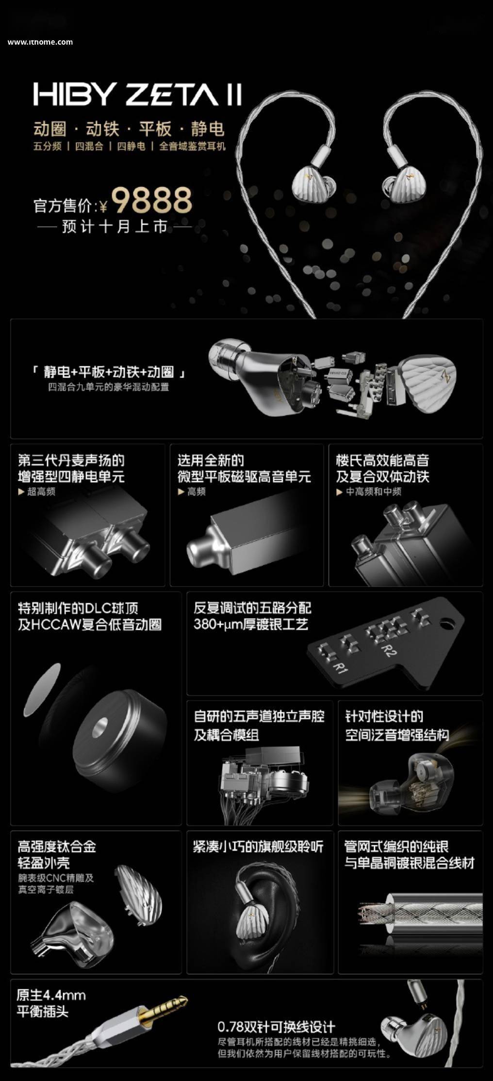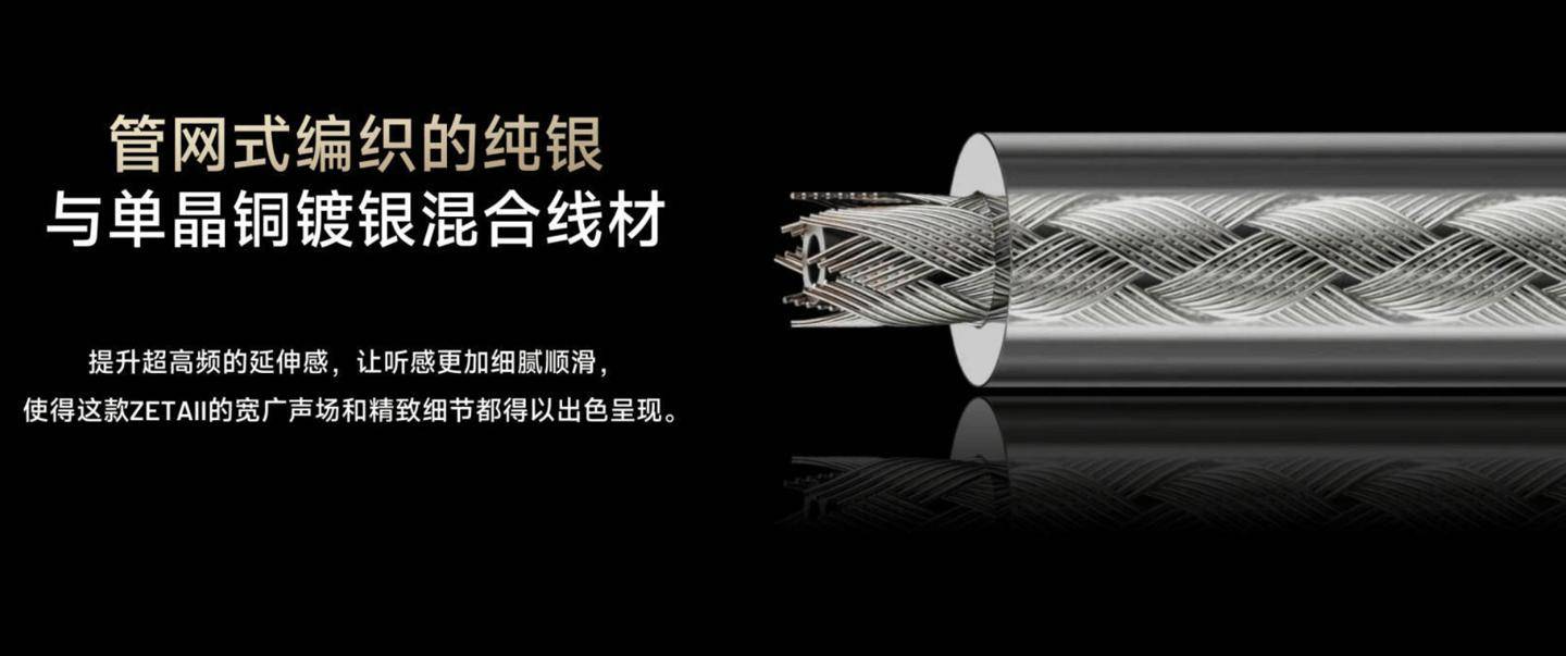 海贝现已推出全新 HIBY ZETA II 旗舰耳机,强调“四混合五分频九单元”设计,定价为 9888 元。 IT之家获悉,这款耳机采用钛合金外壳,使用 CNC 精雕面板,标配 WG01 及 WG02 声导管液态硅胶套。线材方面号称采用 4N 纯银及 5N 单晶铜镀银两种材质,以特别比例交叉编织而成,使用 4.4mm 平衡接口,同时也做了 0.78 双针可换线设计。 该耳机采用“四混合五分频九单元”配置,超高频部分使用第三代丹麦声扬增强型四静电单元,高频部分选用全新微型平板磁驱高音单元;中高 / 中频部分使用楼氏动铁;中低和低频部分使用 DLC 球顶复合低音动圈。同时耳机还使用空间泛音增强结构,让高频的延伸和泛音得到进一步提升。