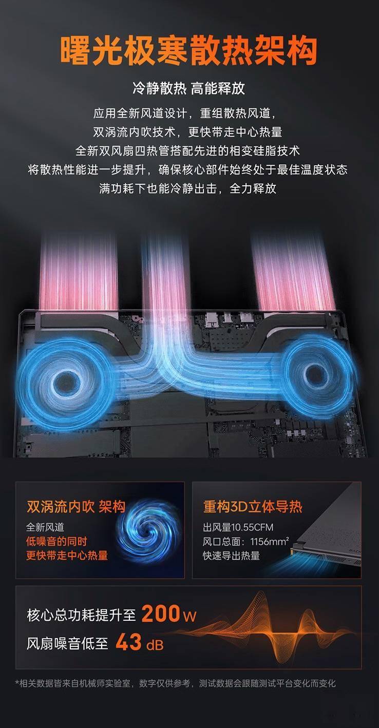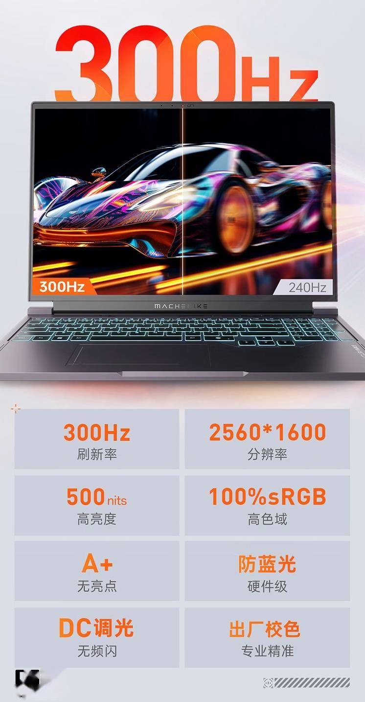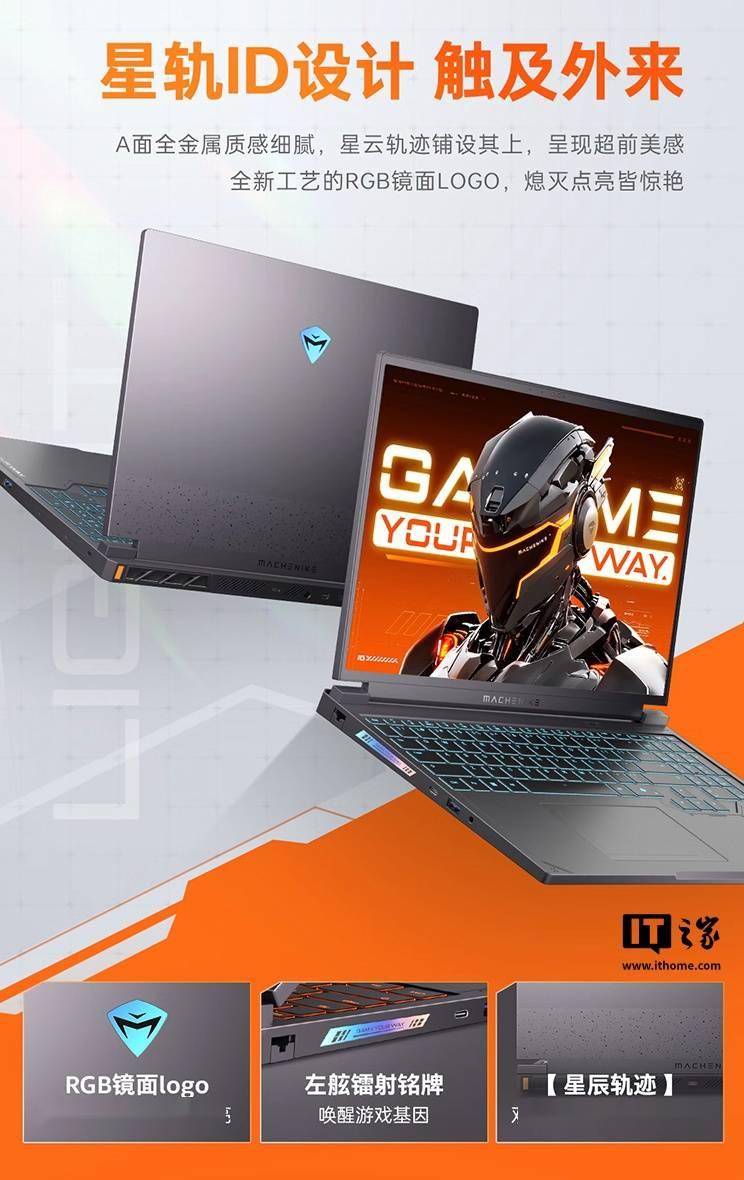 机械师曙光 16S 游戏本在外观上采用星轨 ID 设计,整体重量 2.5 千克,厚度 23 毫米,支持 180° 开合,同时带有 Nahimic 音效。 该机 A 面采用全金属质感,搭配全新工艺 RGB 镜面 LOGO;B 面匹配 16 英寸 2560×1600 分辨率 300Hz 刷新率星幻屏(500 尼特亮度、100% sRGB 色域);C 面搭载炫彩 RGB 独立数字键区全尺寸键盘,匹配下沉式方向键,采用类玻璃触控板。 该机搭载 24 核 32 线程英特尔酷睿 i9-13900HX 处理器,使用 16/32G DDR5 RAM 和 1TB PCIe 4.0 SSD,至高搭载 140W 英伟达 GeForce RTX 5070 Ti 显卡,搭载双超薄冰刃静音风扇 + 3D 四热管。笔记本内置 80Wh 电池(支持 140W 快充,配备 250W SIC 迷你适配器)。 接口方面,该机提供一个 USB-C 3.2 Gen 2 接口(10Gbps+PD100W / 140W 私有协议),一个电源接口,一个 Mini DP,一个 HDMI 2.1 (48Gbps) 接口,同时还有一个安全锁孔,三个 USB-A 3.2 Gen 1 接口,一个 2.5G RJ-45 千兆网线接口,一个 USB-C 3.2 Gen 2 接口(10Gbps + DP + PD 100W)、还有一个 3.5mm 音频接口。
