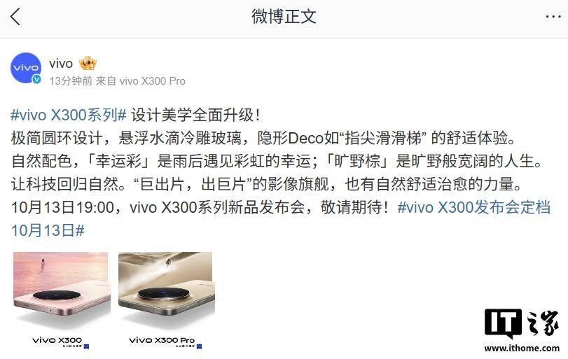 vivo 今日上午宣布,年度影像旗舰 vivo X300 系列新品发布会将于 10 月 13 日 19:00 举行。 根据 vivo 官方最新预热,vivo X300 系列手机设计美学全面升级:极简圆环设计 + 悬浮水滴冷雕玻璃,隐形 Deco 号称如“指尖滑滑梯”的舒适体验。系列新机还将拥有自然配色,包括「幸运彩」和「旷野棕」。 IT之家注意到,vivo X300 系列手机真机图已经曝光,拥有幸运彩、自在蓝、旷野棕、惬意紫配色。vivo 产品副总裁黄韬此前介绍称,这次 X300 标准版手机将搭载蔡司 2 亿超级主摄,而 X300 Pro 则搭载 85mm 蔡司 2 亿 APO 超级长焦,两颗镜头分别搭载“超越 Pro 级”的 CIPA 4.5 级防抖、“行业最强”CIPA 5.5 级防抖,拥有蔡司 T * 镀膜及 X200 Ultra 同款的深吸收蓝玻璃。 视频方面,这次 X300 Pro 将全球首发 4K 60fps 人像视频、双焦段 4K 120fps 杜比视界 HDR、双焦段 4K 120fps 10 bit Log,号称是“安卓视频之王”。 此外,这款手机还将首发天玑 9500 处理器,搭载蓝图影像芯片 V3+、OriginOS 6、苹果生态互联、硬件 1nit 京东方 Q10 Plus 屏幕。