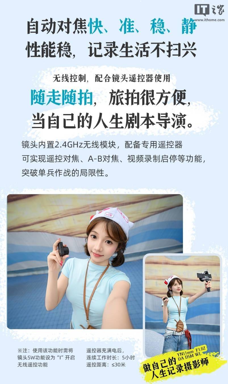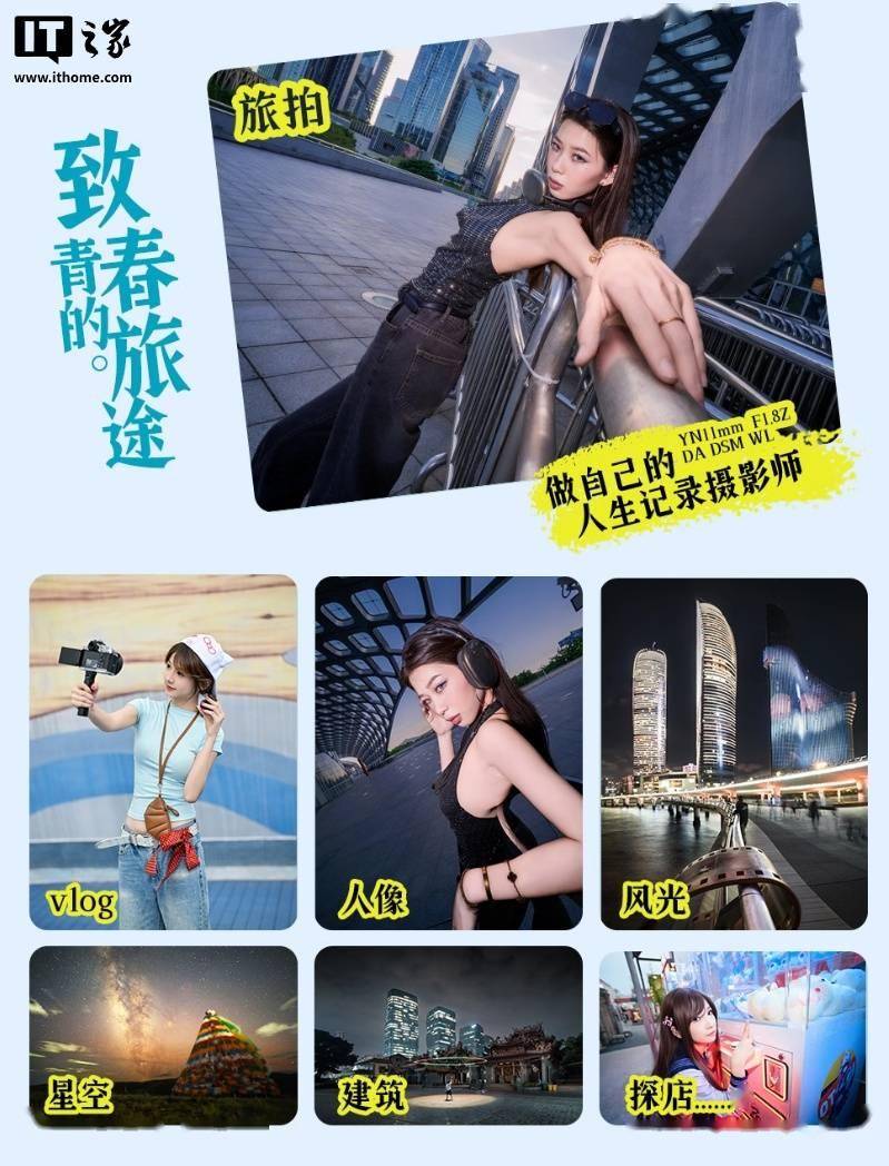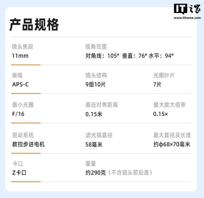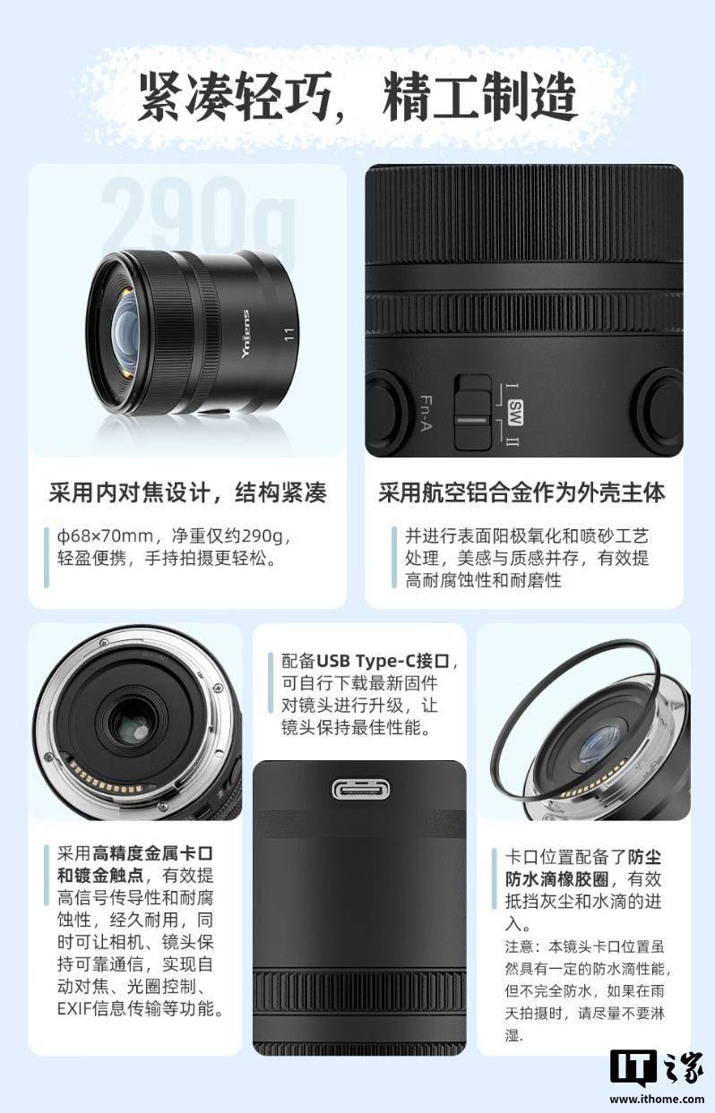 IT之家 9 月 23 日消息,永诺 YN 11mm f/1.8 超广角镜头现已新增尼康 Z 卡口,适配 APS-C 半画幅相机,主打轻量化设计,建议零售价 1688 元。 据官方介绍,这款镜头采用轻量化设计,重 390 克,等效 35mm 全画幅焦距约为 16mm,适合拍摄人像、风光、建筑、星空等题材的作品,内置 DSM 数控步进电机对焦马达,结合对焦算法可获得快速、平滑的自动对焦体验。 这款镜头采用 9 组 10 片光学玻璃镜片,搭载纳米多层镀膜,内置非球面镜片、低色散镜片,还配有防污氟镀膜,配有内对焦设计,对焦时镜头不会伸出,其外壳为航空铝合金材质,提高耐磨性和耐腐蚀性,卡口位置配备防尘防水胶圈,可有效抵挡灰尘和水滴侵入。 此外,这款镜头还配备双 Fn 自定义功能键,可根据不同需求分别为两个按键设置不同功能,提升拍摄效率,镜身拥有控制环,可根据需求将光圈 / ISO 等常用功能分配到控制环,进行快速调参,还支持永诺自家的无线遥控器,可远程调节各项参数。 IT之家附该镜头详细参数如下: 目前这款镜头已在各大电商平台上架,售价 1688 元。