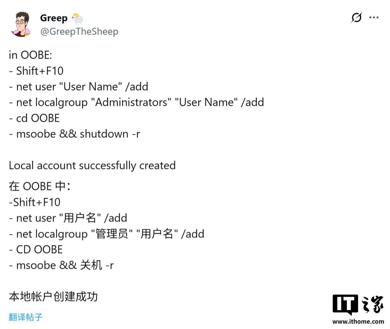 在微软实施更严苛限制,在 Windows 11 系统装机首次开机设置(OOBE)环节,封堵所有绕过本地账号变通方法不到 24 小时,消息源 @TheBobPony 就在 X 平台发布推文,表示 BypassNRO 注册表方式依然有效。 IT之家曾于 10 月 7 日报道,在 Windows 11 Build 26x20.6772 预览版中,微软实施更严苛限制,强制要求用户在“首次开箱体验”(OOBE)阶段连接互联网并登录微软账户(MSA)。 目前已确认多个绕过变通方案失效: 在该消息公布不到 24 小时后,绕过限制的办法已在网络出现。X 平台用户 @TheBobPony 演示了一个简单方法: 1. 在 OOBE 环节断开网络 2. 输入 Shift + F10 进入命令行界面 3. 输入以下命令 reg add HKLM\SOFTWARE\Microsoft\Windows\CurrentVersion\OOBE /v BypassNRO /t REG_DWORD /d 1 /fshutdown /r /t 0 另一位用户 @GreepTheSheep 也分享了绕过微软限制,继续创建本地账号的方法: 1. 在 OOBE 环节断开网络 2. 输入 Shift + F10 进入命令行界面 3. 输入以下命令 net user "User Name" /addnet localgroup "Administrators" "User Name" /addcd OOBEmsoobe && shutdown -r 此外根据科技媒体 Windows Report 报道,Windows 11 专业版中依然存在“Join a domain instead”路径,意味着用户可以切换到本地账号,不过伴随着微软进一步收紧相关策略,该选项未来可能会发生调整。