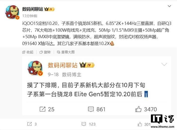 iQOO 官方今天宣布,“未来性能旗舰”iQOO 15 手机将于 10 月 20 日 19:00 在深圳发布,号称“不是产品型号名的简单跨代,而是产品力的真正跨代领先!” IT之家注意到,根据官方此前公布的已经博主 @数码闲聊站 给出的信息,iQOO 15 手机将搭载最新的第五代骁龙 8 至尊版处理器,配备自研 Q3 芯片,采用一块 6.85 英寸的 2K 分辨率屏幕,支持 144Hz 的刷新率。同时,新机还配备一块 7000mAh 的大容量电池,并支持 100W 有线快充和无线充电。 影像方面,iQOO 15 配备一颗 50MP 的 1/1.5 英寸 IMX9 主摄像头,以及一颗 50MP 的超广角镜头和一颗 50MP 的 IMX8 中底潜望镜。 除此之外,iQOO 15 还具备满级防水功能,超声波指纹识别技术,以及封闭式对称双扬声器、091640 X 轴马达。