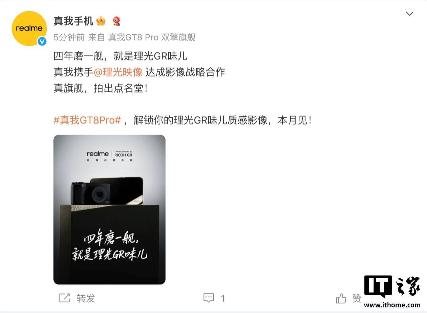 真我 realme 副总裁、全球营销总裁、中国区总裁 @徐起Chase 今天上午宣布,真我与理光映像正式达成影像战略合作。 这是真我和理光 GR 团队四年深度共创的成果。从 2021 年的重庆街拍开始,双方团队就一直在深入地沟通合作,我们团队前后组织了数十轮的讨论共创会,多次飞往理光总部,进行工厂互访;我们甚至派驻了工程师团队到理光,和他们的光学、色彩工程师一起工作,就是为了调出那最纯粹、最正宗的“理光 GR 味儿”。从传感器调校到光影算法,从街拍逻辑到色彩科学,我们把理光 GR 的街拍基因、对光影的执着,实打实揉进了真我 GT8Pro 里。这次,是真的让手机学会了理光 GR 相机的光影语言。