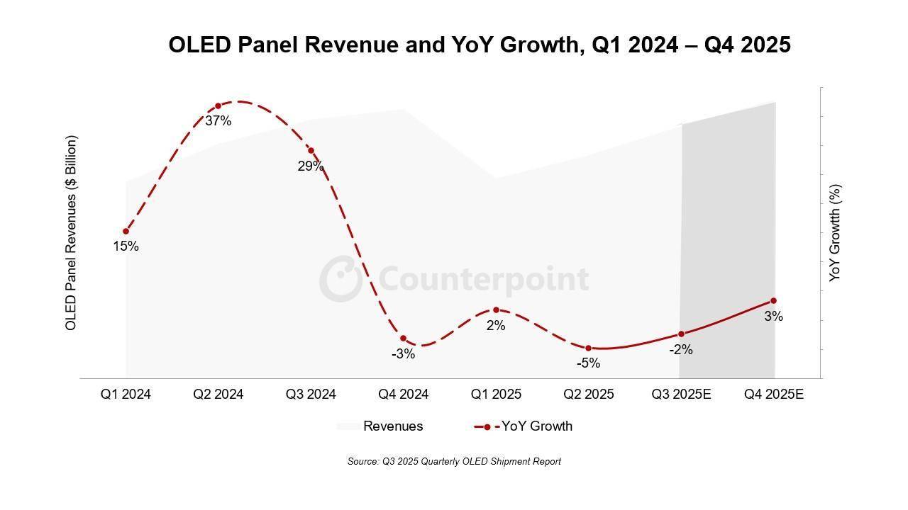 市场调查机构 CounterPoint Research 昨日(10 月 8 日)发布博文,预估 2025 年第 3 季度 OLED 面板出货量同比增长 1%,收入预计同比下降 2%,该季度的销量增长主要集中在显示器和笔记本电脑上。 该机构指出 2025 年第 2 季度全球 OLED 面板收入同比下降 5%,而第 3 季度由于智能手机面板出货量同比增长 2%,以及显示器和笔记本电脑出货量同比增长两位数,OLED 面板收入同比降幅收窄至 2%。 整体而言,该机构认为在强劲的需求复苏和新增 OLED 产能的支撑下,2025 年全年 OLED 面板总收入将小幅下降,不过 2026 年收入将出现更强劲的反弹。在智能手机、笔记本电脑和显示器推动下,2025 年全年 OLED 面板出货量预估将同比增长约 2%。 细分到厂商方面,IT之家基于博文内容,简要介绍下相关情况: 三星显示(Samsung Display) 三星显示在 2025 年第 2 季度 OLED 面板中,得益于笔记本电脑和智能手表三位数的环比增长,以及电视两位数的环比增长,出货量占比攀升至 35%,出货额占比达到 42%。 该机构预计 2025 年第 3 季度三星显示的出货额份额将达到 44%,2025 年全年出货额比例将达到 41%,略低于 2024 年的 42%。 LG Display 2025 年第 2 季度,LG Display 的面板面积份额提升至 38%,但面板收入份额下降至 21%,主要原因是智能手机出货量环比下降两位数,但电视出货量增长两位数,智能手表出货量增长个位数,部分抵消了这一影响。预计 2025 年第 3 季度 LGD 的收入份额为 22%,全年份额为 21%,低于 2024 年的 23%。 京东方 由于智能手机和笔记本电脑的环比两位数增长被智能手表的两位数下降所抵消,京东方的出货量和出货额份额分别下滑至 9% 和 15%。 该机构预计 2025 年第三季度京东方的收入份额将维持在 12%,2025 年全年份额将稳定在 14%,与 2024 年持平。 天马 2025 年第二季度,天马的 OLED 出货量份额下降至 5%,出货额份额也下降至 6%。尽管该公司不生产 OLED 电视,限制了出货额的增长,但受智能手机和智能手表需求的支撑,其收入环比增长了 8%。预计 2025 年第三季度天马的出货额份额将达到 6%,全年出货额份额将达到 6%,高于 2024 年的 5%。