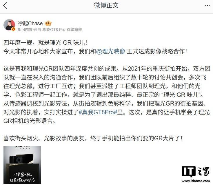 realme 今日宣布,真我 x 理光影像战略合作发布会将于 10 月 14 日举行,共同见证移动影像的越级时刻。 IT之家注意到,真我 realme 副总裁、全球营销总裁、中国区总裁 @徐起Chase 今天上午已经宣布,真我与理光映像正式达成影像战略合作。 这是真我和理光 GR 团队四年深度共创的成果。从 2021 年的重庆街拍开始,双方团队就一直在深入地沟通合作,我们团队前后组织了数十轮的讨论共创会,多次飞往理光总部,进行工厂互访;我们甚至派驻了工程师团队到理光,和他们的光学、色彩工程师一起工作,就是为了调出那最纯粹、最正宗的“理光 GR 味儿”。从传感器调校到光影算法,从街拍逻辑到色彩科学,我们把理光 GR 的街拍基因、对光影的执着,实打实揉进了真我 GT8 Pro 里。这次,是真的让手机学会了理光 GR 相机的光影语言。
