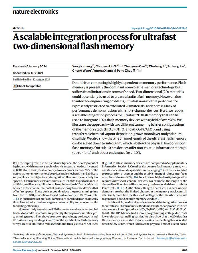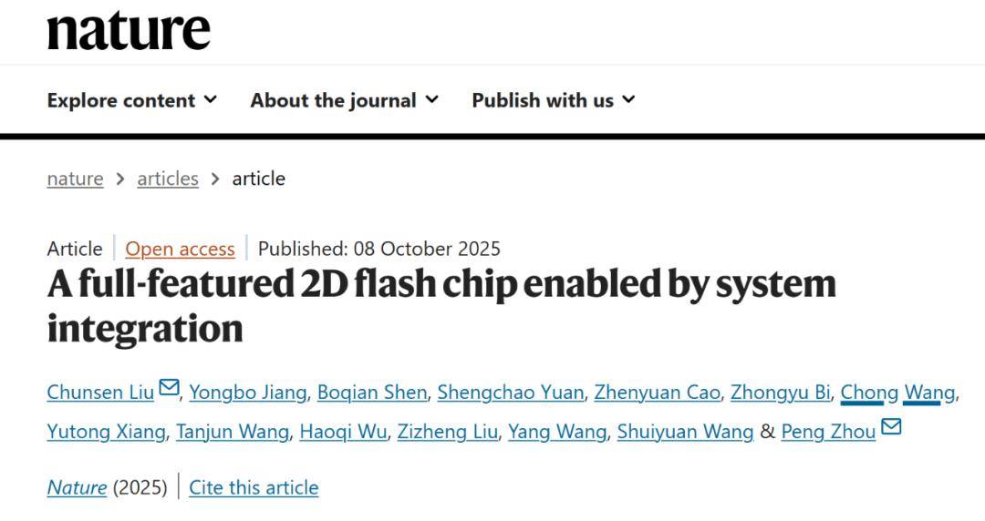 据复旦大学微信公众号消息,时隔半年,继“破晓(PoX)”皮秒闪存器件问世,复旦大学在二维电子器件工程化道路上再获里程碑式突破!复旦大学集成芯片与系统全国重点实验室集成电路与微纳电子创新学院周鹏-刘春森团队研发的“长缨(CY-01)”架构将二维超快闪存器件“破晓(PoX)”与成熟硅基 CMOS 工艺深度融合,率先研发出全球首颗二维-硅基混合架构芯片。 封装后的二维-硅基混合架构闪存芯片(带 PCB 板) 复旦大学称,这一突破攻克了新型二维信息器件工程化的关键难题,为新一代颠覆性器件缩短应用化周期提供范例,也为推动信息技术迈入全新高速时代,提供强力支撑。 相关研究成果以《全功能二维-硅基混合架构闪存芯片》(A full-featured 2D flash chip enabled by system integration)为题于北京时间 10 月 8 日晚间在《自然》(Nature)期刊上发表。 当前,CMOS(Complementary Metal Oxide Semiconductor,互补金属氧化半导体)技术是集成电路制造的主流工艺,市场中的大部分集成电路芯片均使用 CMOS 技术制造,产业链较为成熟。团队认为,如果要加快新技术孵化,就要将二维超快闪存器件充分融入 CMOS 传统半导体产线,而这也能为 CMOS 技术带来全新突破。 二维-硅基混合架构闪存芯片结构示意图,包含二维模块、CMOS 控制电路和微米尺度通孔 基于 CMOS 电路控制二维存储核心的全片测试支持 8-bit 指令操作,32-bit 高速并行操作与随机寻址,良率高达 94.3%。这也是迄今为止世界上首个二维-硅基混合架构闪存芯片,性能“碾压”目前的 Flash 闪存技术,首次实现了混合架构的工程化。 “从第一个原型晶体管到第一款 CPU 花了大约 24 年,而我们通过把先进技术融入工业界现有的 CMOS 产线,这一原本需要数十年的积累过程被大幅压缩,未来可以进一步加速探索颠覆性应用。”刘春森总结。 世界首颗二维-硅基混合架构闪存芯片。左侧为半导体晶体管从原型器件到第一款 CPU。右侧为二维闪存器件结构、8 英寸流片 CMOS 晶圆、二维-硅基混合架构闪存芯片。 为了找到这条“正确的路”,团队前期经历了 5 年的探索试错,在单个器件、集成工艺等多点协同攻关。团队的第一项集成工作发表于 2024 年的 Nature Electronics,在最理想的原生衬底上实现了二维良率的突破,这为他们在真实复杂的 CMOS 衬底上解决问题提供了基础。 2024 年 Nature Electronics 人们现在所说的芯片多由硅材料制作。而硅材料和二维材料可以说天差地别 —— 硅片厚度往往在几百微米,一些薄层硅至少也有几十纳米;而二维半导体材料是原子级别,相当于厚度不到 1 纳米。 如何将二维材料与 CMOS 集成又不破坏其性能,是团队需要攻克的核心难题。CMOS 电路表面有很多元件,如同一个微缩“城市”,有高楼也有平地,高低起伏;而二维半导体材料厚度仅有 1-3 个原子,如同“蝉翼”般纤薄而脆弱,如果直接将二维材料铺在 CMOS 电路上,材料很容易破裂,更不用谈实现电路性能。 “就好比我们从太空看上海,似乎很平坦,但这个城市内部其实有 400 多米、100 多米或者几十米高度不等的建筑。如果铺一张薄膜在城市上方,膜本身就会不平整。”周鹏形象比喻道。 这也是为什么全世界的二维半导体研究者目前只能在极为平整的原生衬底上加工材料。一种解决思路是将 CMOS 的衬底“磨平”以适应二维材料,但要实现原子级平整并不现实。 二维-硅基混合架构闪存芯片光学显微镜照片 “我们没有必要去改变 CMOS,而需要去适应它。”团队决定从本身就具有一定柔性的二维材料入手,通过模块化的集成方案,先将二维存储电路与成熟 CMOS 电路分离制造,再与 CMOS 控制电路通过高密度单片互连技术(微米尺度通孔)实现完整芯片集成。 二维-硅基混合架构闪存芯片透射电子显微镜照片 正是这项核心工艺的创新,实现了在原子尺度上让二维材料和 CMOS 衬底的紧密贴合,最终实现超过 94% 的芯片良率。团队进一步提出了跨平台系统设计方法论,包含二维-CMOS 电路协同设计、二维-CMOS 跨平台接口设计等,并将这一系统集成框架命名为“长缨(CY-01)架构”。 衔接起实验室成果与产业化需求,确保理论创新与应用转化能够“双腿并行”,是周鹏-刘春森团队在研究中相互交织的两条主线。依托前期完成的研究成果与集成工作,此次打造出的芯片已成功流片。 从基础研究到工程化应用,团队已跨越最艰难一步,后续迭代进程将进一步加快。他们下一步计划建立实验基地,与相关机构合作,建立自主主导的工程化项目,并计划用 3-5 年时间将项目集成到兆量级水平,期间产生的知识产权和 IP 可授权给合作企业。