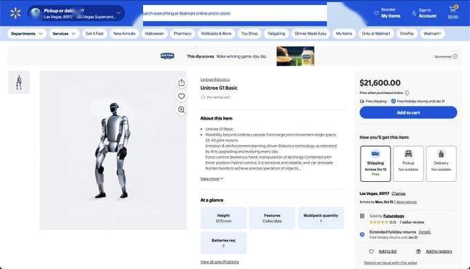 沃尔玛美国网站近日上架中国宇树 G1 人形机器人,基本款售价为 21600 美元(IT之家注:现汇率约合 15.4 万元人民币),免费送货,一次可以订购六台。作为对比,宇树 G1 人形机器人基本款在中国的售价为 9.9 万元。 社交媒体 X 平台(原 Twitter)用户 @geogod42 发布商品截图并评论称:“中国的机器人都上沃尔玛了,而美国的实验室甚至还没寄出 5 台,这简直太离谱了。” 知名机器人研究员克里斯・帕克森(Chris Paxton)在转发相关帖子时评论道:“我认为机器人技术真正惨痛的教训将是,大规模部署廉价机器人将让人们能够解决机器人技术的核心问题。这正是我们现在从例如宇树科技以及越来越多像 Galaxea 这样的公司身上看到的情况。。” 尽管此次登陆沃尔玛属新动向,但宇树 G1 早已是全球众多高校与研究机构中的常客。相较于动辄数十万乃至百万美元售价的竞争机型,G1 凭借相对低廉的价格和出色的性能表现,已成为人工智能与机器人领域前沿开发者首选的实验平台,例如,亚马逊 FAR 机器人团队曾利用宇树 G1 成功演示其 OmniRetarget 系统,将仿真环境中学习到的复杂操作技能零微调地迁移至真实物理机器人上,实现了从虚拟到现实的无缝对接。 尽管在沃尔玛上架令人意外,但这与宇树科技降低机器人开发门槛的整体战略高度一致。该公司正积极追求规模化与普及化,这一愿景也体现在其即将推出的、价格更为亲民的 R1 型号上。9 月 26 日,宇树科技创始人兼 CEO 王兴兴在第四届数贸会上表示,R1 机器人明年会成为全球最畅销的人形机器人。今年 7 月 25 日,宇树科技正式发布第三款人形机器人 Unitree R1,该机器人售价 3.99 万元起,支持开发 / 改制,重量约 25 公斤,集成语音和图像多模态大模型。 通过将 G1 投放至沃尔玛这类巨型在线零售商,宇树显著降低了采购壁垒,对于缺乏工业供应链资源的小型实验室、初创企业甚至资金充足的个人爱好者而言,获取高性能机器人平台的难度大幅下降。 此次动作正值总部位于杭州的宇树科技筹备大规模扩张之际。有报道称,公司正为可能估值数十亿美元的 IPO 做准备。通过将其硬件推向更加开放和可及的销售渠道,宇树不仅是在销售机器人,更是在培育一个庞大的开发者生态系统 —— 鼓励更多人基于其平台开发技能与应用,从而形成技术创新的良性循环。 尽管普通消费者短期内不太可能像购买日用品一样顺手将 G1 加入购物车,但其出现在沃尔玛本身已释放出明确信号:机器人技术正以前所未有的速度走向成熟。曾经仅限于顶尖科研机构使用的高端工具,如今只需一次点击即可触达,这一转变或将极大加速机器人未来的演进进程。