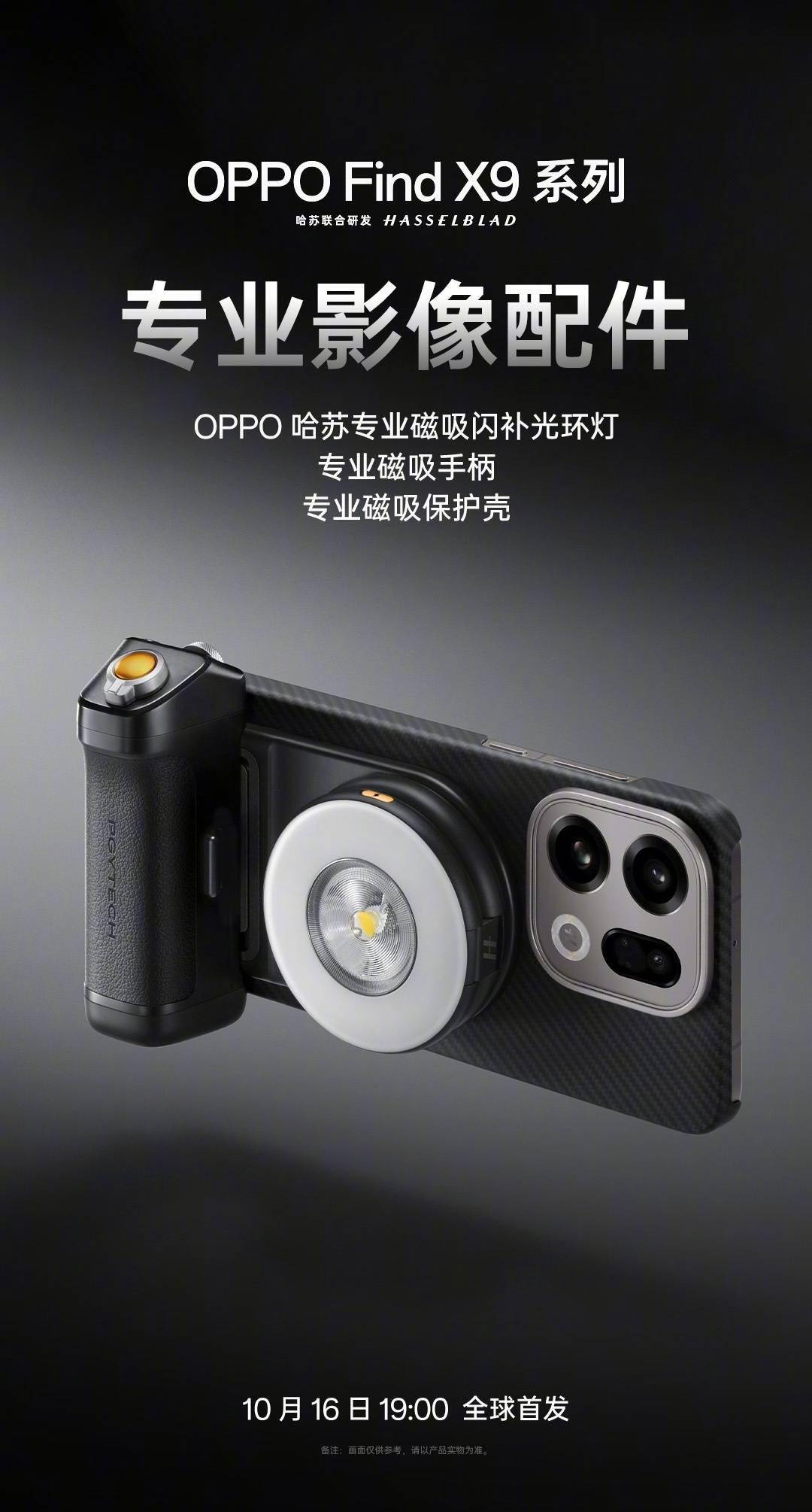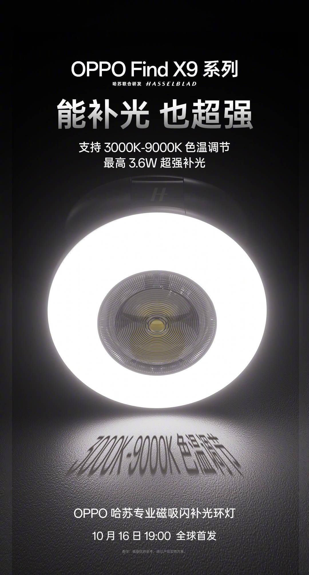今天早些时候,OPPO 宣布推出包括外置镜头、手柄、保护壳在内的专业影像套件。随后,OPPO 又官宣了一款专业影像配件:行业首款手机磁吸闪光外设 ——OPPO 哈苏专业磁吸闪补光环灯。 官图显示,这款闪补光环灯可配合专业影像套件中的手柄、保护壳一同使用,支持 700 张连续打闪、0.5M 2200Lux 闪光亮度,以及 3000K-9000K 色温调节,最高支持 3.6W 补光。 根据 OPPO Find 系列产品负责人周意保介绍,OPPO 哈苏专业影像套装内包含芳纶纤维材质的磁吸保护壳、哈苏增距镜套装、磁吸摄影手柄、哈苏手机肩带。 据IT之家此前报道,博主 @数码闲聊站 本月已将该系列新机的参数进行了汇总。 OPPO Find X9 - 6.59"1.5K OLED 天马直屏,1.15mm 四等边