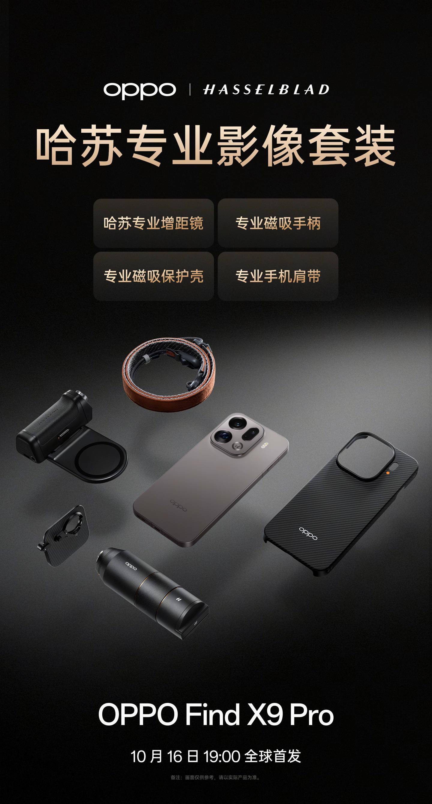 今天上午,OPPO 官宣了全新的 OPPO 哈苏专业影像套装,包含哈苏专业增距镜、全新磁吸手柄、磁吸保护壳、专业手机肩带,号称“口袋中的完全体哈苏”“追星不用背相机”,将于 10 月 16 日与 OPPO Find X9 系列手机一同发布。 在另一则预告视频中,OPPO 称,Find X9 系列手机配备的哈苏 2 亿像素镜头(预计为 Pro)搭配增距镜,可带来 4K 120fps 杜比视界“前排后排都清晰”的影像。 据IT之家此前报道,博主 @数码闲聊站 本月已将该系列新机的参数进行了汇总。 OPPO Find X9 - 6.59"1.5K OLED 天马直屏,1.15mm 四等边
