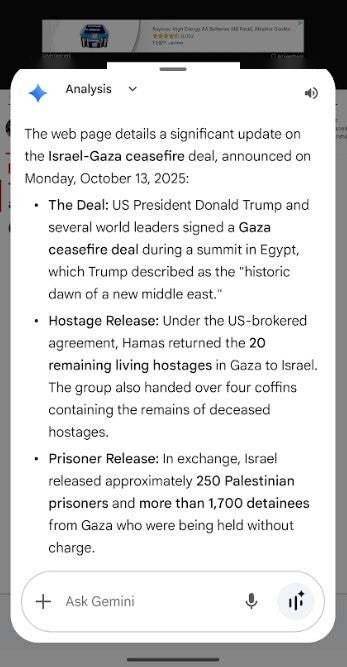 科技媒体 PhoneArena 昨日(10 月 13 日)发布博文,报道称谷歌正为安卓和 iOS 版 Chrome 浏览器,酝酿 AI 增强功能,解决用户面对信息冗杂网页时的阅读难题,借助 Gemini 模型,一键总结当前页面内容,从而帮助用户快速抓住文章核心要点,节省大量阅读时间。 在安卓设备上,运行安卓 16 稳定版或者最新 Android 16 QPR2 Beta 2 更新的设备,已系统集成该功能。在 Chrome 浏览器中打开任意网页后,用户只需长按电源键,系统便会调出 Gemini 浮层界面。 在这个界面中,新增了一个明确的“总结”(Summarize)按钮,点击后 Gemini 会立刻分析页面内容并呈现摘要。IT之家附上相关截图如下: 在 iOS 设备上,用户在 iPhone 上打开 Chrome 浏览器并进入目标网页,然后点击地址栏左侧的一个图标(形似带“+”号的堆叠纸张)。 此时屏幕底部会弹出“页面工具”菜单,用户选择带有 Gemini 标志的“询问 Gemini”(Ask Gemini)选项,随后在弹出的 Gemini 界面中点击“总结”按钮,即可获得当前页面的内容摘要。 这项摘要功能的应用范围相当广泛,不仅支持在 Chrome 浏览器中直接阅读的文章,也适用于通过 Chrome 自定义标签页(如 Discover)打开的内容,它还能对谷歌的搜索结果页面以及用户在谷歌新闻应用中阅读的文章进行总结。