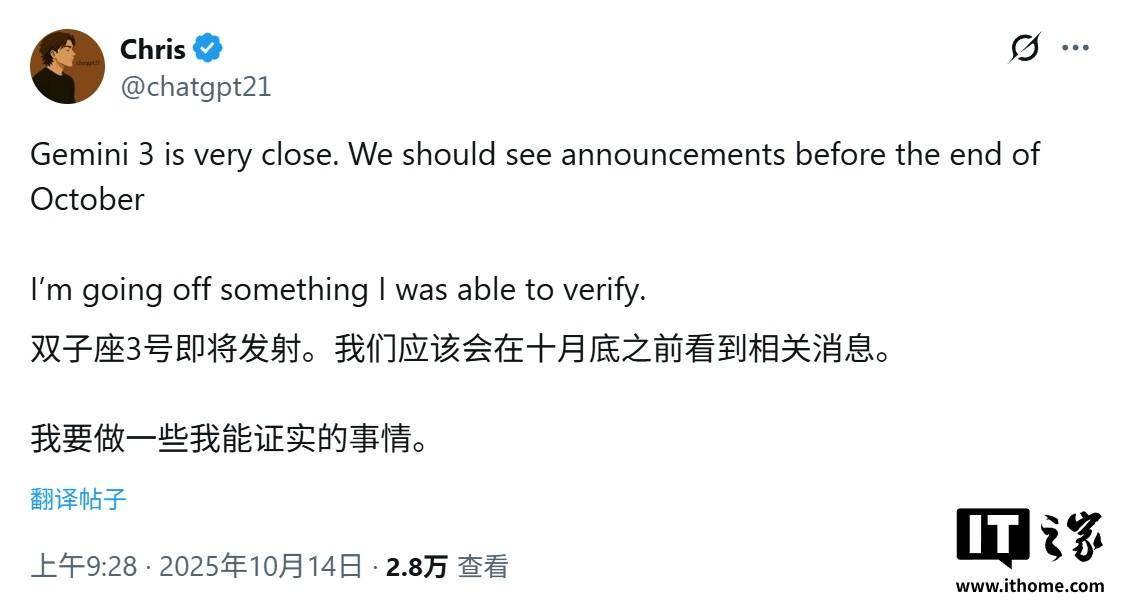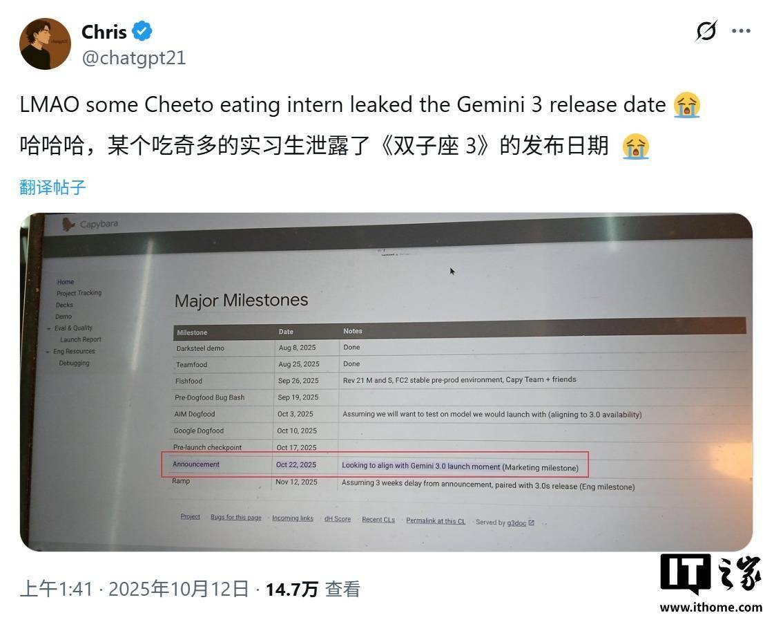 科技媒体 BGR 昨日(10 月 14 日)发布博文,报道称谷歌有望于 10 月 22 日发布下一代 AI 模型 Gemini 3.0,主要改进延迟、成本和编码方面,并显著提升 SVG 图像生成性能。 在 OpenAI 于 8 月初发布 GPT-5、Anthropic 于 9 月底推出 Claude Sonnet 4.5 之后,人工智能领域的竞争日趋白热化,行业目光聚焦于另一位重量级选手谷歌,有望于 10 月 22 日发布 Gemini 3.0。 IT之家援引博文介绍,此次爆料的核心证据是一张在 Reddit 和 X 等社交平台上传播的截图,内容似乎是谷歌内部的“重大里程碑”规划表。 该表格明确提及计划于 10 月 22 日“宣布”Gemini 3.0,文件内容显示,谷歌可能早在今年 8 月就已启动了 Gemini 3.0 的内部测试。 根据目前流出的零星信息,Gemini 3.0 预计将在多个维度超越现有的顶尖模型 Gemini 2.5 Pro。首先,新模型有望优化延迟和成本控制方面,这意味着更快、更经济的 AI 服务。其次,传闻称提升其编码能力,并且会扩展其智能体功能,让其能更自主地完成复杂任务,而不仅仅是作为聊天机器人存在。 更具体的性能提升体现在特定任务上。有用户在网上发布的对比图显示,Gemini 3.0 在生成 SVG(可缩放矢量图形)方面的表现远优于 Gemini 2.5 及其他模型,图像细节和准确性均有显著飞跃,不过这些图片的真实性同样有待验证。 此外,还有媒体推测,谷歌可能会同步升级其视频生成工具至 Veo 3.1,并推出由 Gemini 3.0 Pro 驱动的 Nano Banana 轻量化模型。