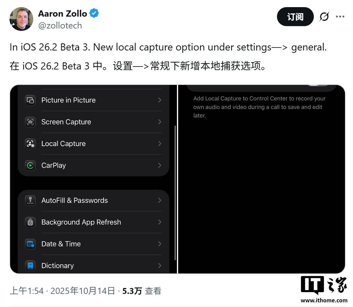 科技媒体 MacRumors 昨日(10 月 14 日)发布博文,报道称苹果发布了 iOS 26.1、iPadOS 26.1、macOS 26.1 Tahoe、tvOS 26.1 和 watchOS 26.1 的第 3 个公测版。 IT之家此前报道,iOS / iPadOS 26.1 第 3 个公测版主要改进如下: Apple TV 应用图标 苹果为配合其流媒体服务从“Apple TV+”更名为“Apple TV”的品牌重塑策略,为该应用设计了全新的图标。新图标告别了以往的灰色设计,转而采用更具活力的彩色外观,这一改动已在包括 iOS、iPadOS 和 tvOS 在内的所有 26.1 Beta 3 系统中实装。 增强音频录制功能 iOS 26.1 Beta 3 在“设置”应用的“通用”选项下,正式加入了“本地录制”(Local Capture)板块。该功能支持用户在使用外接麦克风录制本地音频时,直接调整增益电平(在音频录制中,指对麦克风等输入信号的放大程度。调节增益可以控制录音音量的大小,防止声音过小听不清或过大产生噪音),从而更好地控制录音音量。 苹果还为内容创作者提供了更高的灵活性,用户还可以自定义录制文件的存储位置,或选择仅录制音频模式。 改进 Apple Intelligence 代码层面的发现预示着苹果 AI 战略的重大转变。9to5Mac 分析指出,新代码中的字符串暗示,苹果正准备为“苹果智能”(Apple Intelligence)引入更多第三方 AI 提供商。 苹果此前已确认将与 OpenAI 合作,而新代码将“ChatGPT”替换为更宽泛的“第三方”字样,表明谷歌的 Gemini 等其他 AI 模型可能很快也会被集成到 iOS 系统中,苹果的 AI 生态将变得更加开放。 扩展对第三方智能手表支持 该测试版还显示,苹果仍在继续改进对第三方智能手表的支持。相关代码表明,苹果持续优化用于将 iPhone 通知推送到其他品牌智能手表的“通知转发”(Notification Forwarding)功能,这或许意味着未来 iPhone 用户在选择非 Apple Watch 设备时将获得更好的协同体验。
