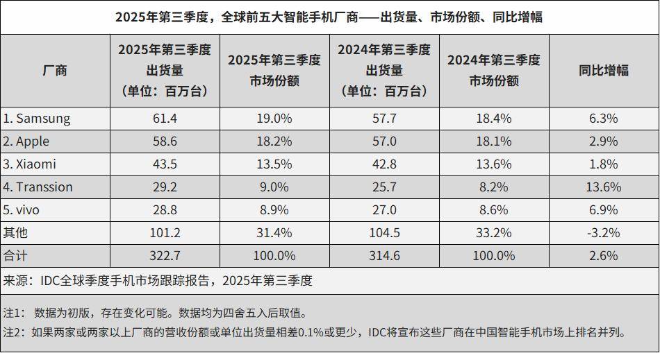 北京时间今天上午,国际数据公司(IDC)发布最新季度手机跟踪初步数据。IT之家从数据获悉,2025 年第三季度,全球智能手机出货量达 3.227 亿部,同比增长 2.6%。在高端市场的带动下,智能手机市场延续复苏态势:创新的外观设计与更具性价比的 AI 智能手机吸引消费者升级设备,成为市场增长的关键动力。 如上图所示,三星该季度出货量达到 6140 万台位居榜首,占市场份额 19%,同比增幅达到 6.3%;苹果屈居第二,该季度拿下 5860 万台的出货量,市场份额为 18.2%,同比增长 2.9%。 小米则凭借 4350 万台的出货量位列第三,该季度市场份额 13.5%,同比增长 1.8%;“非洲之王”传音以 2920 万台出货量取得第四名,市场份额为 9.0%,同比增幅达到了 13.6%;vivo 出货量则是 2880 万台,以 8.9% 市场份额位列榜单第五,同比增幅也有 6.9%。 在中国市场,vivo、苹果、华为、小米、OPPO、荣耀位居该季度出货量前五名,其中 OPPO 和荣耀并列第五。 IDC 分析称,今年第三季度中国智能手机出货量约 6840 万台,同比下降 0.6%,延续下降趋势。该季度属于传统手机销售淡季,新品发布数量较少,且“国补”政策收紧的情况下,消费者消费更趋于理性。随着 9 月中下旬开始,各品牌大量年度旗舰新品的提前集中上市,市场表现在下个季度初期有望得到一定改善。但是之后即便有“双十一”年终大促,也难以激发更多消费者需求。厂商之间的竞争将更加激烈,除需要提供给消费者更有吸引力度的定价和优惠促销,还是要回归本质,打造具备差异化特色,更有吸引力和竞争力的产品来获得更多消费者的青睐。