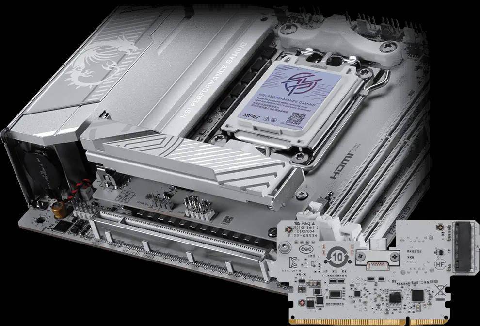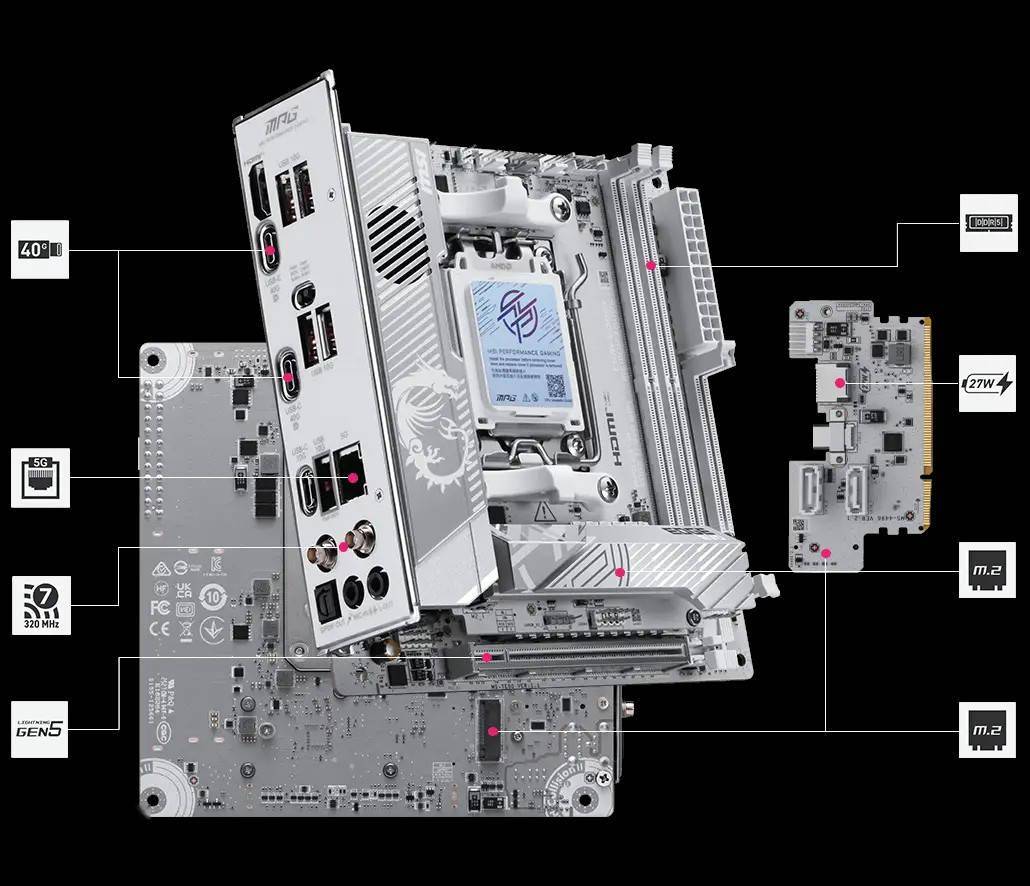 IT之家 10 月 20 日消息,微星 MSI 最近正式在其官网上线了中高端 AMD 800 系列 ITX 主板 MPG X870I EDGE TI EVO WIFI。这款纯白外观的主板配备 64MB BIOS 芯片,搭配锐龙 9000 系列处理器时支持 10000+ MT/s (10+ GT/s)的内存超频。 MPG X870I EDGE TI EVO WIFI 主板采用 12 层 1oz 铜箔服务器级 PCB,配备 8+2+1 项 Duet Rail 供电,其中 Vcore 部分采用 110A SPS DrMOS。 与此前英特尔 800 系平台上的 MPG Z890I EDGE TI WIFI 类似,这款 AM5 ITX 新品也在主 PCIe 插槽上方和内存插槽右侧设有两组子卡结构。 主 PCIe 插槽上方的子卡由两层 PCB 构成,提供了 1 个 PCIe 5.0×4 的 M.2 2280 NVMe 盘位和 2 组接针;而内存插槽右侧的槽位则用于安装 5-in-1 XPANDER 扩展卡,包含 2 个 SATA III 接口、1 个支持 27W PD-out 的前置 USB-C 20Gbps 接针、1 个 USB-C 形态的一分二前置 USB-A 5Gbps 接针和 1 个位于反面的 M.2 2280/2260 PCIe 4.0×4 NVMe 单面 PCB 盘位。 此外,MPG X870I EDGE TI EVO WIFI 还包含 1 个位于背面的 M.2 2280/2260 PCIe 4.0×4 NVMe 单面 PCB 第三盘位;网络方面其搭载了瑞昱 RTL8126 5GbE 有线网卡和支持 Wi-Fi 7 (320MHz) 与蓝牙 5.4 的无线网卡。 后置 I/O 方面,这一主板提供了 2 个 USB-C 40Gbps、1 个 USB-C 10Gbps、5 个 USB-A 10Gbps、1 个 HDMI 2.1 TMDS、1 个 5GbE RJ45、1 对 Wi-Fi 天线插孔、1 个 S/PDIF-out、2 个音频插孔。