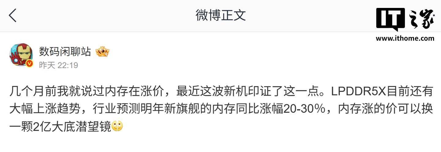 数码闲聊站 昨天在微博表示,他在几个月前就预料到内存会涨价,最近发布的新手机集体印证了这一点。 博主表示,LPDDR5X 内存目前还有大幅上涨的趋势,行业预测明年新旗舰手机的内存同比涨幅可达 20-30%,内存涨的价可以换一颗 2 亿像素大底潜望镜。 后续有用户在评论区表示:“我已经不敢想象明年上 2nm 和内存的价格了”,博主回复道:“没事的,标配的 2nm 芯片会砍一刀”。 据IT之家此前援引《韩国经济新闻》消息,因 AI 带动供需关系变动,谷歌、微软、OpenAI 等巨头都试图大举投资 AI 数据中心,导致 DRAM 等芯片需求急剧攀升。 而根据业内人士的说法,三星、SK 海力士等主要供应链已通知客户,将在 2025 年第四季度把 DRAM 和 NAND 闪存的价格上调最多 30%;同时根据花旗、摩根士丹利等投行的预测,25Q4 的 DRAM 平均售价上调 25-26%,相较原预测上调超过 10 个百分点。