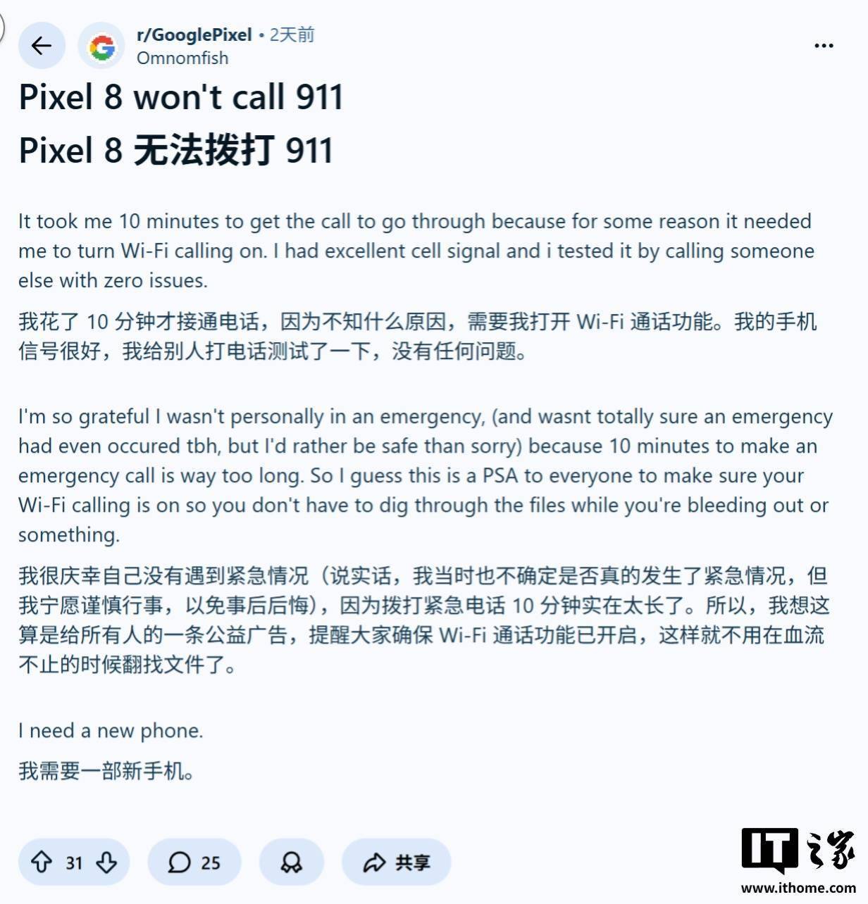 科技媒体 Android Authority 昨日(10 月 24 日)发布博文,报道称多名谷歌 Pixel 手机用户在 Reddit 社区反馈,其设备在紧急情况下无法拨通 911 报警电话。 据用户反馈,该问题涉及的机型和运营商范围较广。一名 Pixel 9 Pro 用户称,他在尝试拨打 911 时,手机不仅未能接通,反而直接显示错误信息并自动重启。 IT之家援引博文介绍,还有 Pixel 10 Pro XL、Pixel 9 Pro XL 和 Pixel 8 的用户报告了类似遭遇,涉及的运营商包括 T-Mobile、AT&T 和 Cricket Wireless。 其中一位 Pixel 8 用户指出,在反复尝试失败后,他通过启用手机的“Wi-Fi 通话”功能,才最终成功联系上紧急服务。 事实上,这并非 Pixel 手机首次在紧急呼叫功能上“掉链子”。回顾过去数年,关于 Pixel 手机无法稳定连接 911 的报告一直时有出现,这一问题似乎已成为一个长期存在的“顽疾”。 该媒体指出由于目前所有报告均来自社交媒体上的用户个例,尚无法确定该问题的具体波及范围有多大。不过,鉴于紧急呼叫是手机最基础、也最重要的功能,任何相关的故障报告都应得到最高级别的重视。