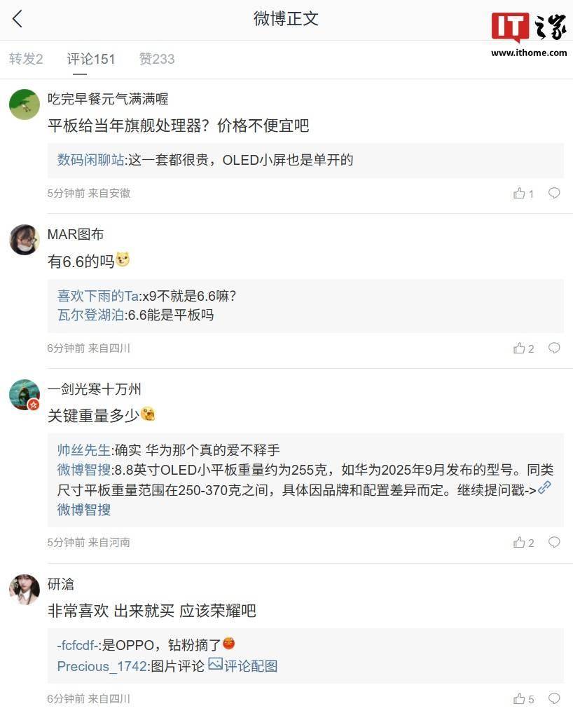 数码闲聊站 今日发文透露,某厂将推出 8.8 英寸左右 OLED 小平板,该机搭载骁龙 8 Elite Gen5 处理器。结合评论区讨论来看,预计为 OPPO 新品平板。 有用户表示“平板给当年旗舰处理器?价格不便宜吧”,博主回复称:“这一套都很贵,OLED 小屏也是单开的。” 据IT之家此前报道,爆料称欧加系有一批神秘“小平板”正在测试 SM8850 移动平台(即“第五代骁龙 8 至尊版”处理器),预计明年上半年将和搭载天玑 9500 / 第五代骁龙 8 至尊版处理器“小屏旗舰”一同亮相。 目前各家都有规划 / 推出小平板产品,苹果、联想、红魔、REDMI 均已推出旗舰小平板,尺寸 8.3 英寸-9.06 英寸左右。在 10 月 23 日的 REDMI K90系列新品发布会上,小米 REDMI K Pad 还上新了“流金白”配色;荣耀中国区智慧生活业务部部长林林也透露荣耀小平板没鸽,明年亮相。 ▲ IT之家开箱:OPPO Pad 5 柔光版图赏