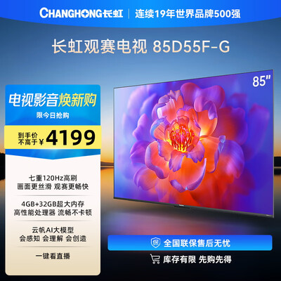 长虹电视85D55F-G1和长虹电视85D55F-G非常好用,功能强大超薄,音响效果和电影院有的一拼,运动补偿看起来非常流畅,性价比很高。电视清晰度高,运行速度:快外形外观:得体屏幕音效:好功能效果:不错电视画面清晰,方便实用,安装也挺方便的。音效挺好的,长虹电视85D55F-G1电视质量非常好,画面清晰放在客厅里面非常漂亮,大小合适视听效果非常满意,商家非常热情五星好评。由H怂偷剑兔接好,服蘸馨簦 可以接唱歌很特。我推]朋友!