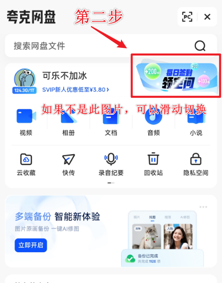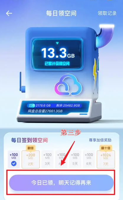 新老用户都可签到领取 1 次空间容量,1 周内连续签到,第二天和第七天可以领取更多容量! SVIP 每天最低可领取 100MB,第二天领取 200MB,第七天领取 1GB!!!