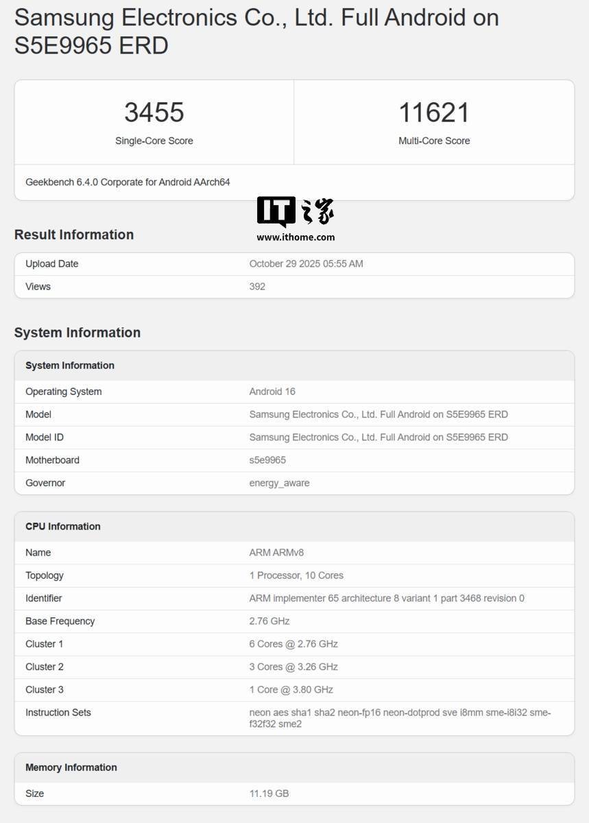 科技媒体 Android Authority 昨日(10 月 29 日)发布博文,报道称在 2025 年第 3 季度财报会议上,三星移动体验部门副总裁 Daniel Araujo 为其 2026 年的旗舰产品 Galaxy S26 系列奠定了基调。 Araujo 明确表示 Galaxy S26 系列将迎来重大革新,通过“以用户为中心的下一代 AI、第二代定制应用处理器(AP)以及包括全新相机传感器在内的更强性能,彻底改变用户体验”。 Araujo 提到的“第二代定制 AP”引发了外界对芯片配置的广泛猜测。这很可能证实 Galaxy S26 系列至少在部分地区将搭载 Exynos 2600 芯片,据报道该芯片将是三星首款采用 2nm 工艺的产品。 同时,此前的行业消息也指出,高通的骁龙 8 Elite Gen 5 芯片同样会用于 S26 系列。这意味着三星将再次沿用“双芯片”策略,根据不同市场和机型搭载不同处理器。不过,Araujo 在会后补充说芯片评估仍在进行中,最终方案尚未确认。 IT之家查询公开资料,代号为“S5E9965 ERD”的三星测试设备于昨日再次现身 GeekBench 跑分库,单核成绩为 3455 分,多核成绩为 11621 分,其多核分数已超越骁龙 8 Elite Gen 5 的平均水准。