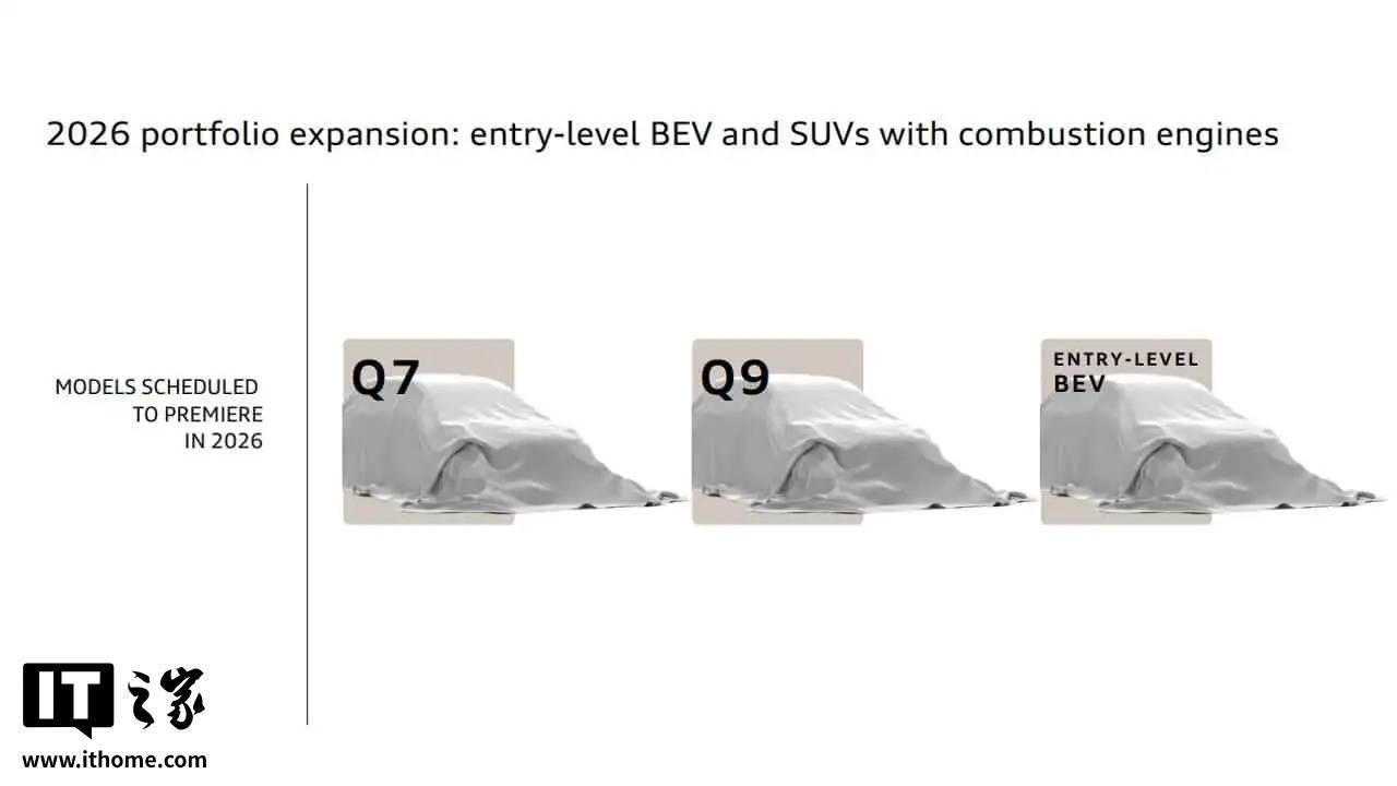 不过,奥迪的新车攻势远未结束。在等待 2027 年推出量产版 Concept C 跑车的同时,2026 年将成为奥迪产品阵容的关键一年。根据该公司在发布第三季度财报后向投资者披露的文件,奥迪预告了明年即将推出的三款重磅新车:下一代 Q7、奥迪首款全尺寸 SUV Q9,以及一款入门级纯电动车。