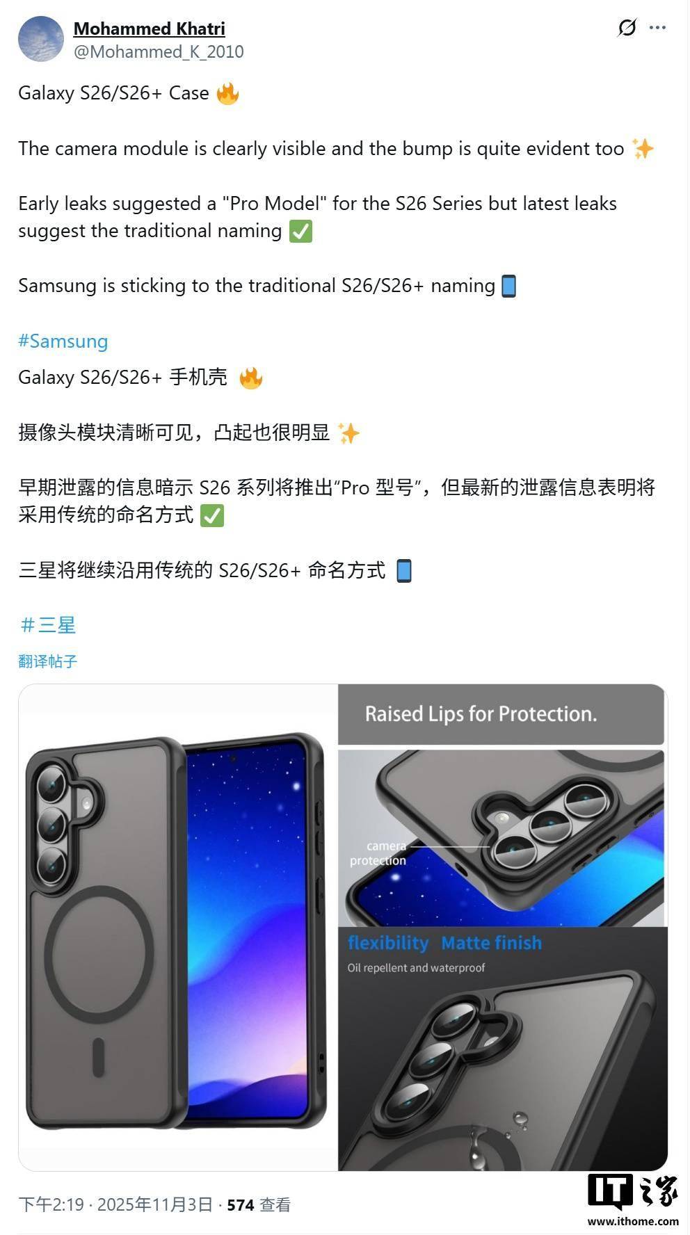 消息源 Mohammed Khatri 昨日(11 月 3 日)在 X 平台发布推文,分享了一组来自配件厂商的渲染图,展示了三星 Galaxy S26 标准版佩戴手机壳后的效果。 根据渲染图展示的细节,三星 Galaxy S26 标准版的边角更为圆润,前置摄像头延续了屏幕顶部的居中挖孔设计。 其核心变化在于背面,图片展示了三个垂直排列的摄像头单元,它们被整合在一个凸起的条形模块(即“相机岛”)内。IT之家附上截图如下: 三星将 Galaxy S26 的机身厚度从 S25 的约 7.2 毫米削减至 6.96 毫米,减少了超过 0.2 毫米。因此,这一变化或许是三星决定放弃 S25 上那种为每个镜头配备独立金属环的设计,转而采用一体式药丸状相机岛的原因之一,更纤薄的机身可能无法容纳原有的独立镜头结构,一体化设计则有助于优化内部空间。