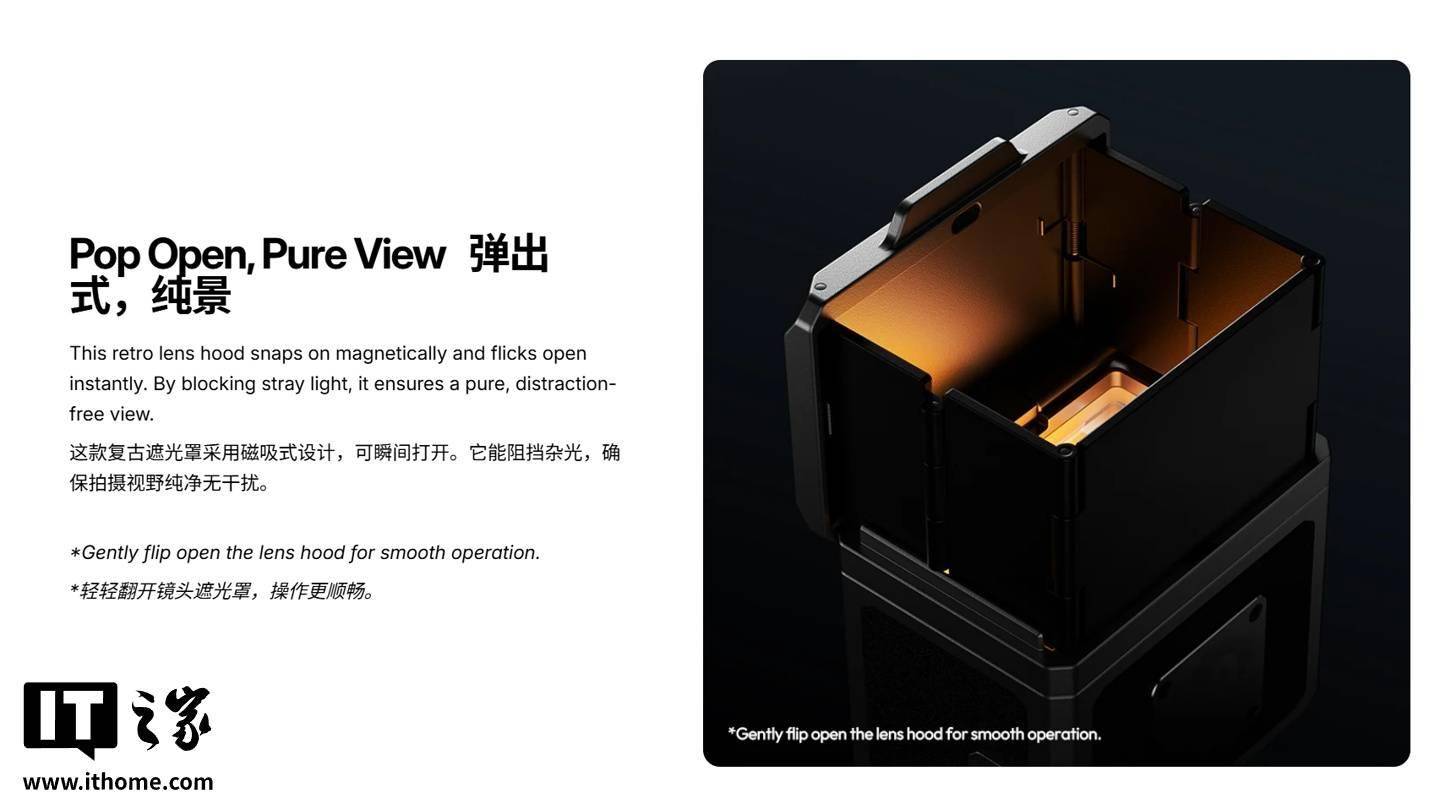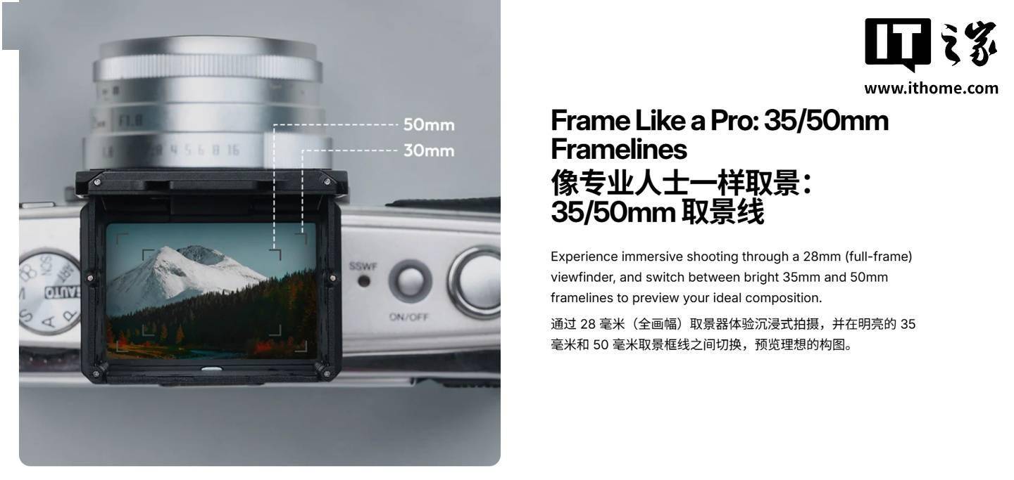 IT之家 11 月 4 日消息,优篮子现已在海外市场推出 VF01 外置腰平取景器,主打复古外观设计,标准焦距是 28mm,内置 35mm / 50mm 双框线,可让数码相机用户也体验到胶片时代腰平取景器的魅力。 据介绍,这款取景器内置 3 片高透光率镜组,可减少画面畸变和伪影,带来更清晰的视觉体验,顶部拥有磨砂玻璃调焦屏,其标准焦距是 28mm(35mm 全画幅),内置 35mm 和 50mm 两种框线,可为标准焦距的镜头预览构图。 设计方面,这款取景器拥有磁吸式复古遮光罩,只需要按一下侧边按钮就能弹起,还能够遮蔽户外环境的杂光,带来更纯净的拍摄体验,还可让没有翻转屏的数码相机也能轻松取景,适合街拍、风光、低角度拍摄等拍摄题材,采用冷靴与相机连接,因此无论是胶片还是数码相机都能轻松使用。 不过需要注意的是,这款取景器没有任何电子结构,因此其画面只能用作参考构图用,对焦还是需要半按相机快门、看取景器的裂像 / 黄斑才能完成,同时由于没有视察补偿等机构,在取景器里看到的画面可能与最终拍摄画面有所区别。 目前这款取景器已在海外市场上市,价格 39.99 美元(IT之家注:现汇率约合 284.8 元人民币)。