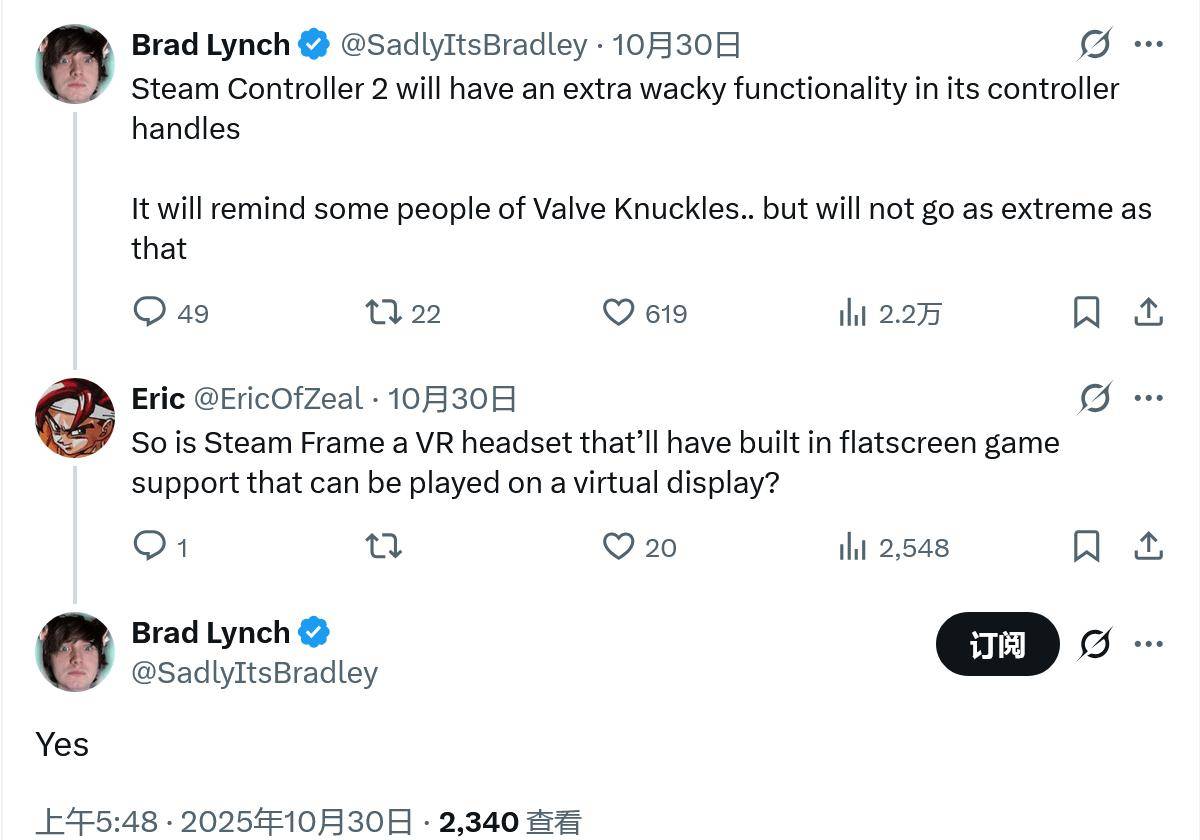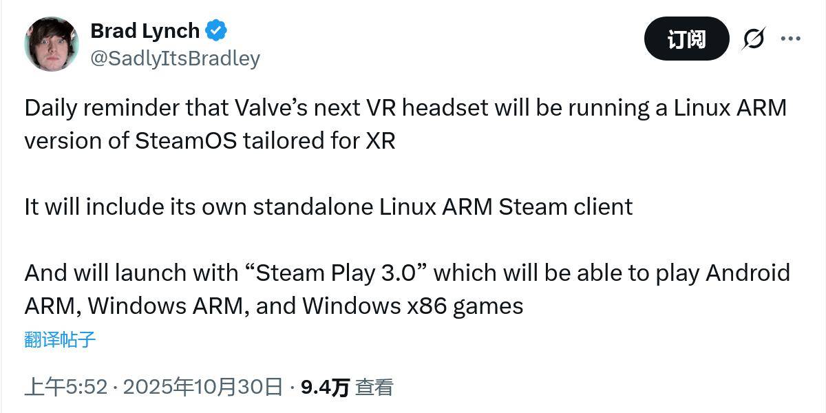 知名 XR 领域博主 Brad Lynch 表示,Valve 未来的 VR 头显产品将配备 Arm 指令集处理器,运行一个专为 XR 设备定制的 Arm 兼容 SteamOS Linux 发行版。 该设备将拥有独立的 Linux Arm SteamOS 客户端,并支持所谓的 "Steam Play 3.0" 兼容转译,可游玩 Android 系统 Arm 适配、Windows 系统 Arm 适配、Windows 系统 x86 适配游戏。 此外,Valve 的下一代 VR 头显将支持眼部追踪,不过 Brad Lynch 暂未获知有关面部追踪的任何信息。 对于新的 Steam Controller 2,Brad Lynch 认为其不仅可作为常规 VR 控制器使用,还将提供传统游戏交互支持。