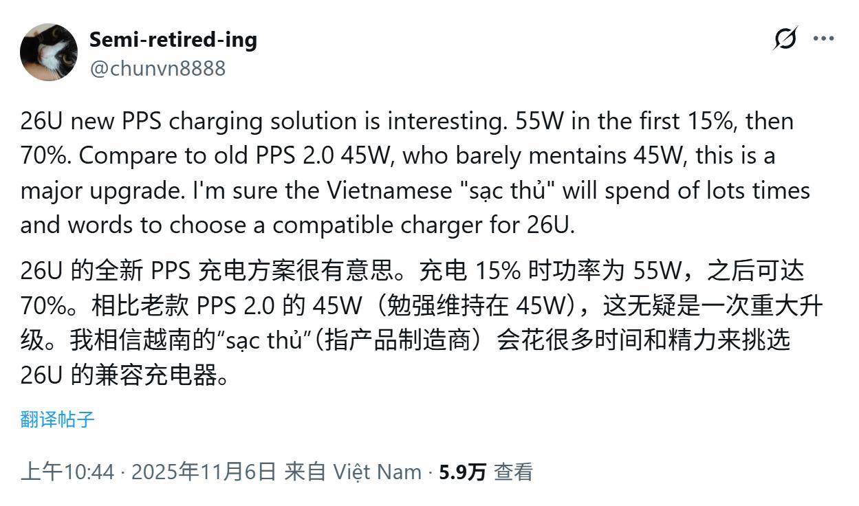消息源称唯一的硬件变动来自 3 倍光学变焦镜头。三星计划用一颗 1200 万像素的 S5K3LD 传感器,取代目前使用的 1000 万像素 3 倍长焦镜头,不过科技媒体 smartprix 认为,像素提升了 20%,但预计在实际成像效果上的提升将较为有限。 该手机还将搭载三星全新的 APV(高级专业视频)编解码器,可在不损失画质的前提下大幅减小视频文件大小。据报道,APV HQ 模式每分钟 4K 视频消耗约 1.5GB 文件,而画质较低的 APV LQ 模式则消耗约 750MB 文件。 充电方面,消息源称 Galaxy S26 Ultra 手机采用全新的 PPS 充电解决方案,预估官方宣传支持 60W 充电,在实际充电过程中,在 0-15% 的充电阶段将以 55W 的功率开始,在 15-70% 的充电阶段稳定在 45W。 相比较三星现有的 45W 充电方案,在 0-20% 的充电阶段不到 45W,在 20~35% 充电阶段降低至 34W,后续随着电池温度升高和充电量增加,功率还会进一步降低。