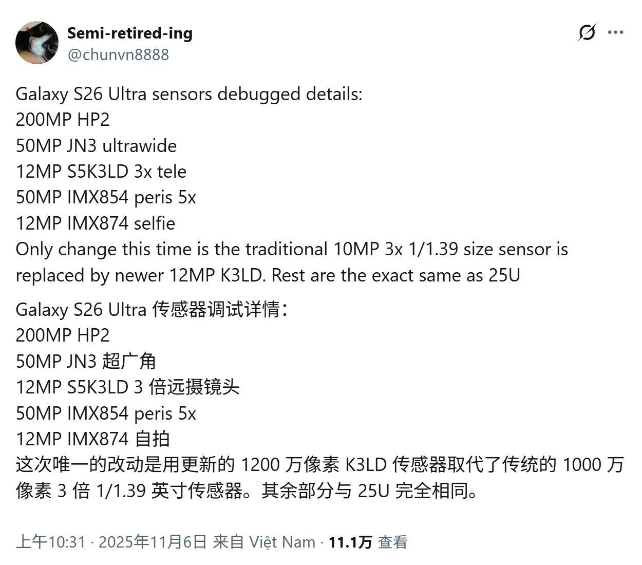 消息源 @chunvn8888 昨日(11 月 6 日)在 X 平台发布推文,曝料了三星 Galaxy S26 Ultra 旗舰手机的细节,影像硬件方面升级 3 倍光学变焦镜头,充电方面支持 60W。 影像硬件方面,消息源指出 Galaxy S26 Ultra 基本沿用了 Galaxy S25 Ultra 的配置方案,IT之家附上相关配置如下: - 2 亿像素的 HP2 主摄像头
