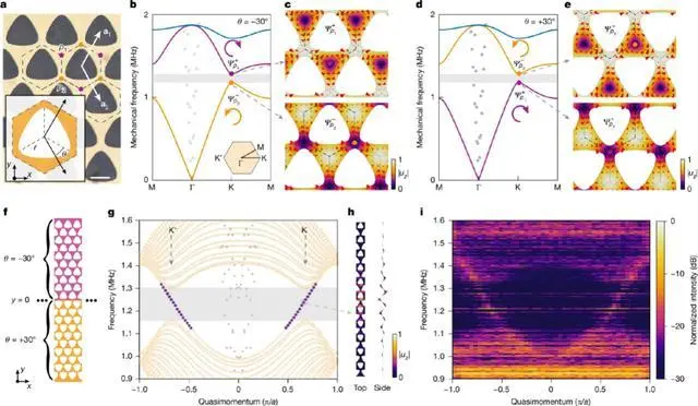 图|沿两个拓扑结构不同的区域界面引导的面外振动模式的渲染图(来源:Nature) 本研究首次将两种物理机制融合。其一是“谷-霍尔(Valley-Hall)拓扑效应”:研究者在一层 20 纳米厚的氮化硅(SiN)膜上刻蚀出蜂窝状微孔。通过旋转三角形孔的方向,构造出两种相反“谷态”(valley edge mode)的声子晶格。两者之间的界面就像一条高速路,每个方向上仅允许带特定谷自旋的振动能量沿其边缘流动,并天然抑制反散射。