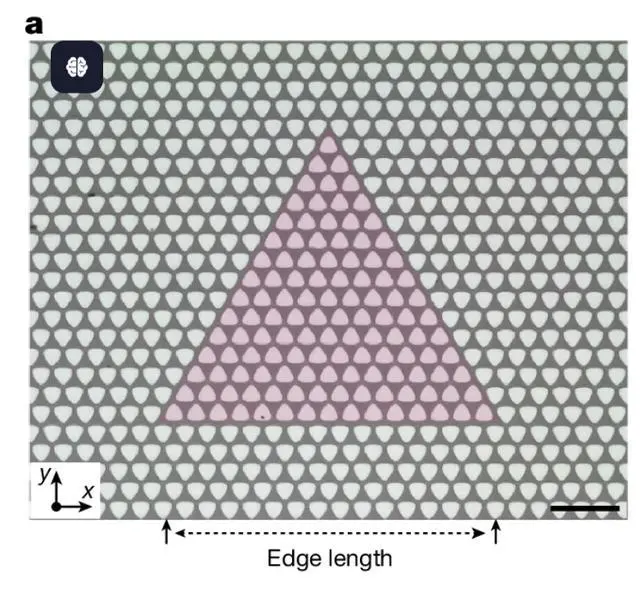图|谷霍尔效应拓扑绝缘体(来源:Nature) 图|拓扑声子波导围绕成三角形路径的显微镜图像。(来源: Nature) 为了测试能量损耗,研究团队将波导“折”成一圈三角形路径,每条边仅 15–19 个晶格单元长,三角形的三个顶点处由 120° 弯角连接各边。实验显示,波导中声子的传播损耗低至 3dB/km。相较之下,以往芯片声子波导的损耗通常在 10⁵dB/km 量级。值得注意的是,这一损耗水平已与超导微波波导相当,并逐渐逼近光纤。