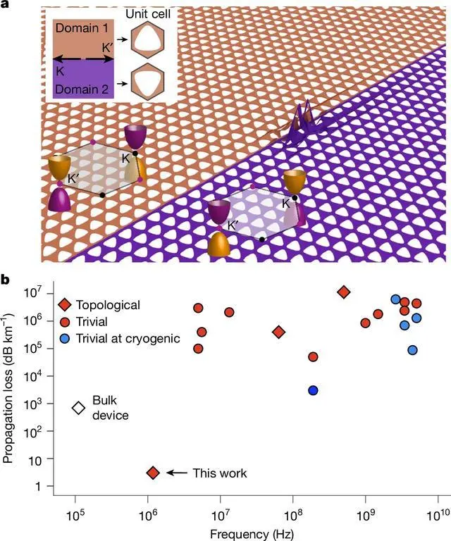 然而,拓扑效果虽然可以防止散射,但并不能防止能量损耗(衰减)。与电子不同,声音极易在弯折处泄漏能量。过去研究中的芯片级声子波导(不论是否拓扑)损耗都比较大,大概是每厘米几 dB,非常不理想。