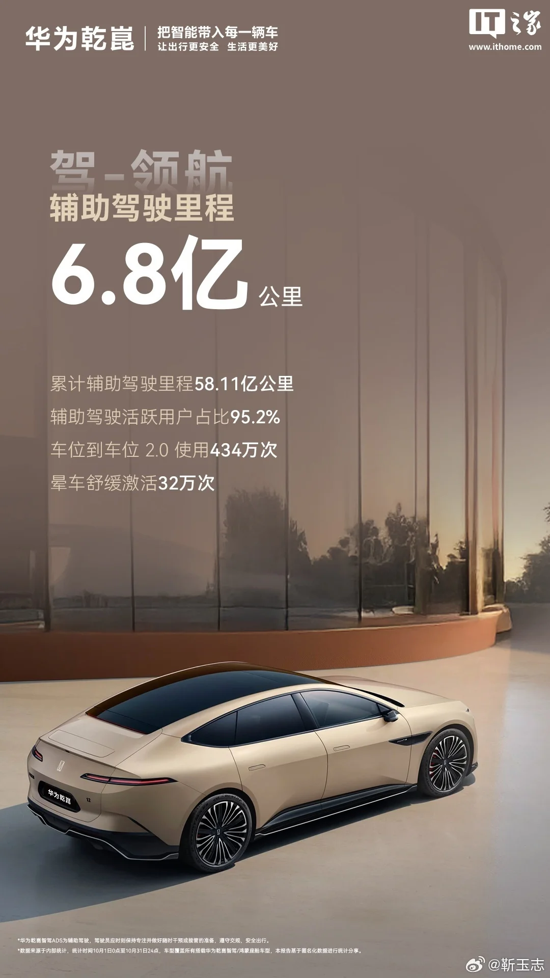 另外,华为智能汽车解决方案 BU CEO 靳玉志 11 月 4 日分享了华为乾崑用户的 10 月出行报告。他宣布,华为乾崑辅助驾驶里程新增 6.81 亿公里,相当于绕赤道 1.7 万圈。同时语音助手被唤醒了 3.44 亿次。