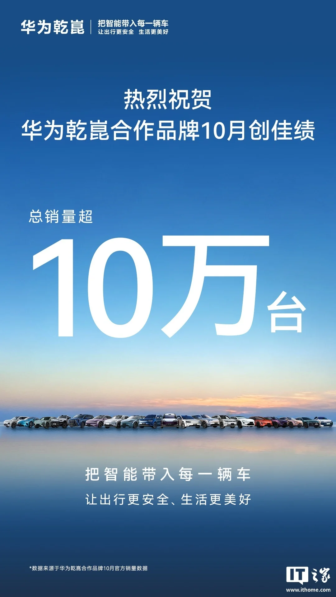 IT之家 11 月 10 日消息,华为乾崑智能汽车解决方案官方微博今日宣布:华为乾崑合作品牌 10 月创佳绩,总销量超过 10 万台(源自车企官方数据)。