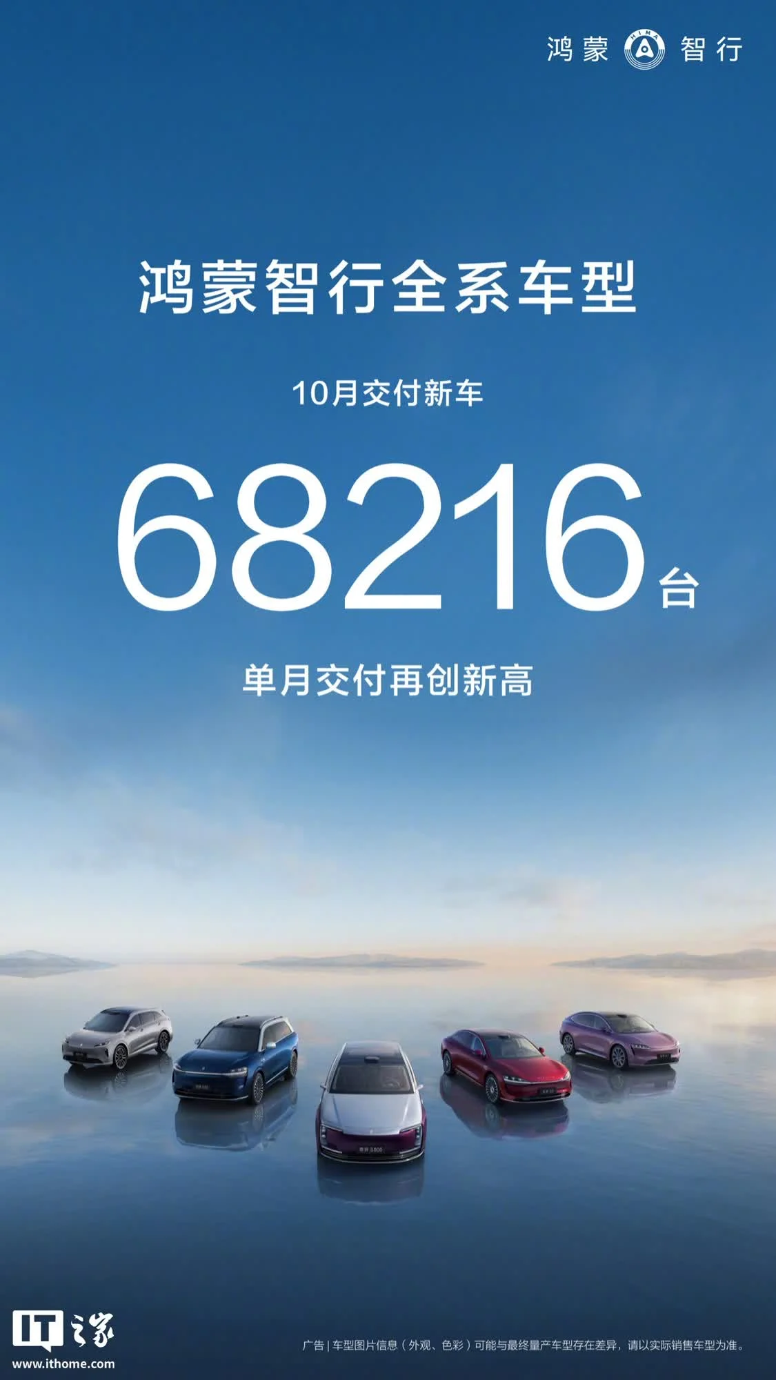 据IT之家此前报道,11 月 1 日晚,鸿蒙智行通过官微宣布:10 月交付情况创下双项纪录:单月交付新车 68216 台,创单月交付量历史新高。全系累计交付已突破 100 万台,创新势力品牌最快达成百万交付纪录,当月成交均价 39 万元。