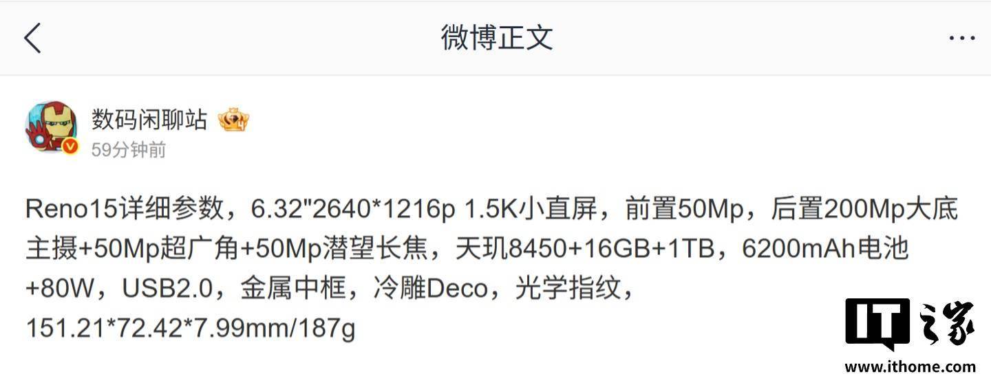 数码闲聊站 今天在微博透露了 OPPO Reno 15 手机的详细参数,配备 6.32 英寸 1.5K 小直屏。 博主表示,这台手机将拥有 2 亿像素大底主摄 +5000 万像素超广角 +5000 万像素潜望长焦,前置摄像头则是 5000 万像素,搭配天玑 8450 芯片,最高内存 / 存储空间配置是 16GB+1TB,内置 6200mAh 电池,支持 80W 有线快充。 ▲IT之家实拍:OPPO Reno 15 此外,这台手机的 Type-C 接口传输速率是 USB 2.0,配备金属中框、冷雕后摄模组,搭载光学屏下指纹识别,尺寸是 151.21*72.42*7.99 mm,重量是 187g。 后续有用户在评论区询问:“这波线下机里只有耀子 500 系列电池容量达到 7K 了吗?”,博主回复道:“荣耀已经跨越到 8 了”;另一名用户则询问道:“Pro 升级了啥?处理器?”,博主则回复道:“唯一 1.15mm 四等边”。 结合IT之家此前援引 OPPO 官方预热,Reno 15 系列手机在设计上将行业首发全息光刻工艺,拥有 1.15mm 极窄四等边直屏,全系配备质感金属中框,拥有星光蝴蝶结、极光蓝、可露丽棕、蜜糖金等配色可选。 ▲IT之家实拍:OPPO Reno 15