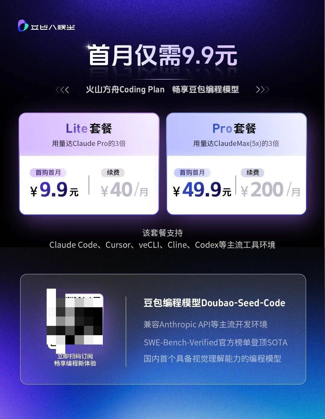 举例来说,创建一个美观的交互式英语学习网站,相同 Tokens 量下(0-32k 输入区间),Claude Sonnet 4.5 成本约 4.05 元,GLM-4.6 约 0.77 元,而 Doubao-Seed-Code 仅 0.34 元。 在此基础上,火山方舟还为个人开发者量身打造了“Coding Plan”优惠计划,进一步释放成本红利,最低首月 9.9 元即可畅享豆包编程模型。该套餐支持 Claude Code,以及 veCLI、Cursor、Cline、Codex CLI 等主流工具环境,更借助火山方舟超大资源池,为开发者提供稳定算力保障,获得畅快和稳定的编码体验。 接入豆包编程模型,TRAE (CN) 企业版正式开放公测 今天,TRAE 中国版正式接入 Doubao-Seed-Code。作为国内首款 AI 原生 IDE,TRAE 为开发者提供智能问答、代码自动补全、自定义智能体等完整的 AI 编程能力。 对于企业开发者,TRAE (CN) 企业版现在正式开放公测,在个人版基础上为企业级开发场景带来全方位升级: 企业场景优化:支持最多 10 万文件数、15,000 万行代码的大型代码库,提供更大的 GPU 集群保障大规模并发场景下的稳定响应; 安全可控:代码加密传输,云端不存储,数据“用后即抛”;支持成员使用数据看板、费用管控等企业级管理能力; 灵活模型管理:企业后台统一配置模型,支持内置模型与自定义模型,全员一键使用。 公测期间企业可享受首月免费(限 20 席位 / 企业),访问火山引擎-TRAE(CN)企业版官方页面,即可提交公测申请。