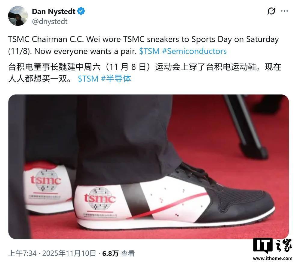 科技媒体 Tom's Hardware 昨日(11 月 10 日)发布博文,报道称在台积电 2025 年度运动会期间,台积电董事长魏哲家身穿的定制台积电品牌运动鞋意外走红,风头甚至盖过了特邀嘉宾英伟达首席执行官黄仁勋。 这双鞋的背后故事颇具戏剧性。IT之家援引博文介绍,其制造商是来自高雄的一家鞋厂。该厂商负责人表示,这双鞋是他在八年前一项商业提案的一部分,当时他将样品寄给了时任台积电董事长张忠谋,但此后便无下文。 如今看到自己的作品意外爆红,他感到既震惊又惊喜。厂商特别强调,这双鞋采用了特殊缝合技术,确保鞋底能持久粘合至少十年。 这次意外的走红,也为双方未来的合作带来了新的契机。魏哲家在接受媒体采访时透露,公司正考虑将这款备受关注的运动鞋纳入官方周边商品的行列。 与此同时,当年提出方案的制鞋商也表示,他正计划整理一份全新的合作提案,再次提交给台积电进行评估。这预示着,普通消费者未来或许有机会购买到台积电官方出品的品牌运动鞋。