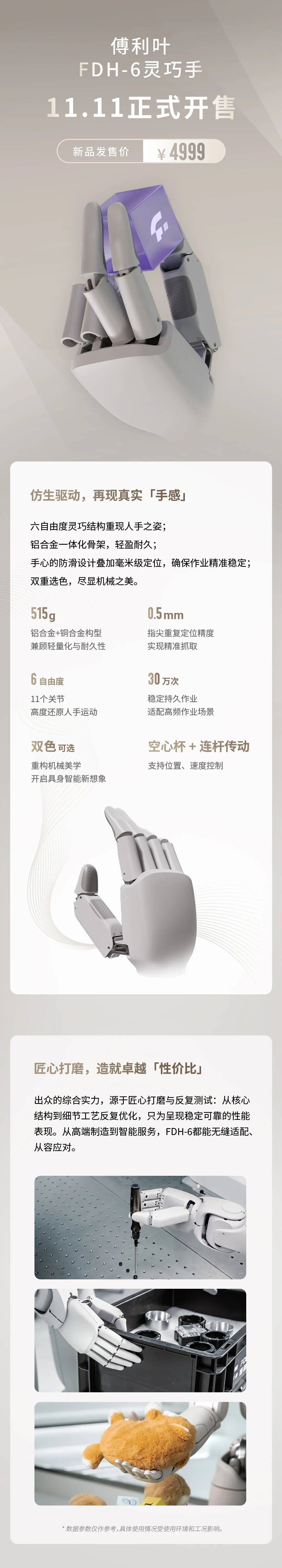 傅利叶今日宣布,FDH-6 灵巧手正式开售,售价 4999 元。这款灵巧手具有 11 个关节、6 自由度的仿生设计,指尖重复定位精度达 0.5 毫米。 IT之家汇总这款灵巧手主要信息如下: FDH-6 重量 515g,指尖重复定位精度 0.5mm,可用 11 个关节、6 个自由度高度还原人手运动,且能适配高频作业场景。同时,其配备支持位置和速度控制的空心杯 + 连杆传动装置。此外,这款灵巧手号称能无缝适配、从容应对从高端制造到智能服务的各种场景。