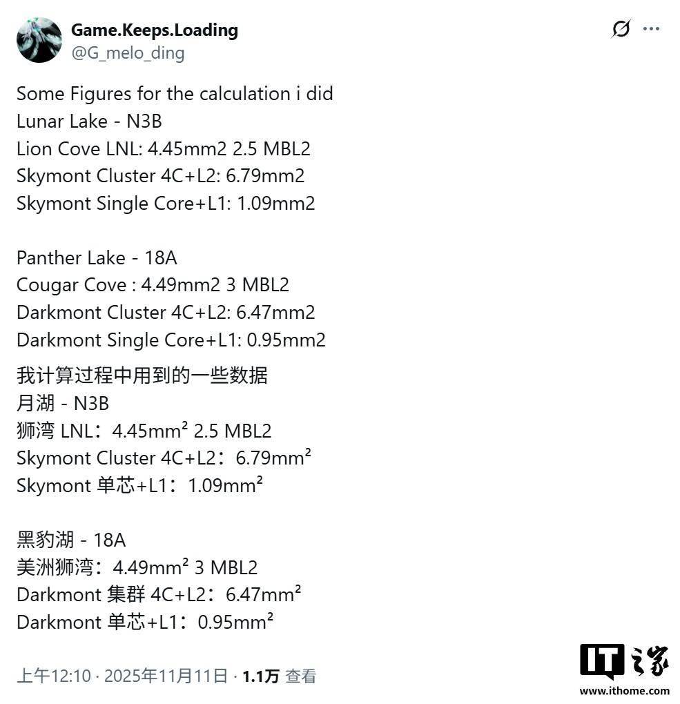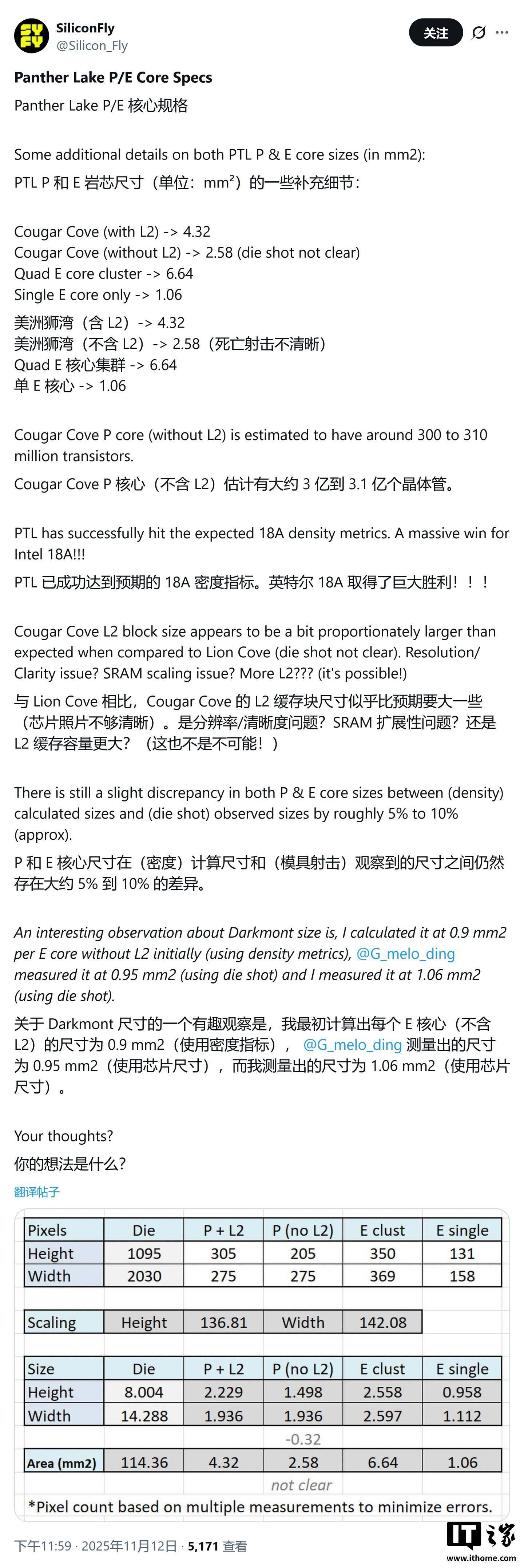 科技媒体 Wccftech 昨日(11 月 12 日)发布博文,报道称英特尔 Panther Lake 处理器(预计命名为酷睿 Ultra 3 系列)迎来关键进展,其核心组件“计算单元”(Compute Tile)的 Die Shot 照片首次被曝光。 据消息源 Game.Keeps.Loading发布的图片显示,该计算单元的内部布局清晰可见。IT之家援引博文介绍,照片中包含了两个“美洲狮峡谷”(Cougar Cove)架构的性能核(P-Core)和三个“黑暗蒙特”(Darkmont)架构的能效核(E-Core)集群,每个集群内含四个核心。 这一布局证实了 Panther Lake 将采用混合架构设计,通过不同类型的核心协同工作,以平衡高性能与低功耗的需求。 该媒体进一步分析 Die Shot 照片,揭示了新一代核心的尺寸细节。数据显示,单个“美洲狮峡谷”性能核的 Die 面积约为 4.49mm²,与 Lunar Lake 处理器中的 Lion Cove 性能核(4.45mm²)基本相当。 然而,“黑暗蒙特”能效核的优化则更为显著,其单位核心面积约为 0.95mm²,相比 Lunar Lake 的 Skymont 能效核(1.09mm²)缩小了约 13%;其四核集群面积也比 Skymont 集群小了约 5%,显示出 18A 工艺在提升晶体管密度方面的优势。 除了核心架构,Panther Lake 的缓存配置也得到披露。每个“美洲狮峡谷”性能核将配备 3MB 的 L2 缓存,而每个“黑暗蒙特”能效核集群(四核)将共享 4MB 的 L2 缓存。 更大的缓存容量通常意味着更高的数据命中率和更低的数据访问延迟,这对于提升处理器的整体运算效率至关重要。这些初步信息为了解 Panther Lake 的性能潜力提供了重要参考。