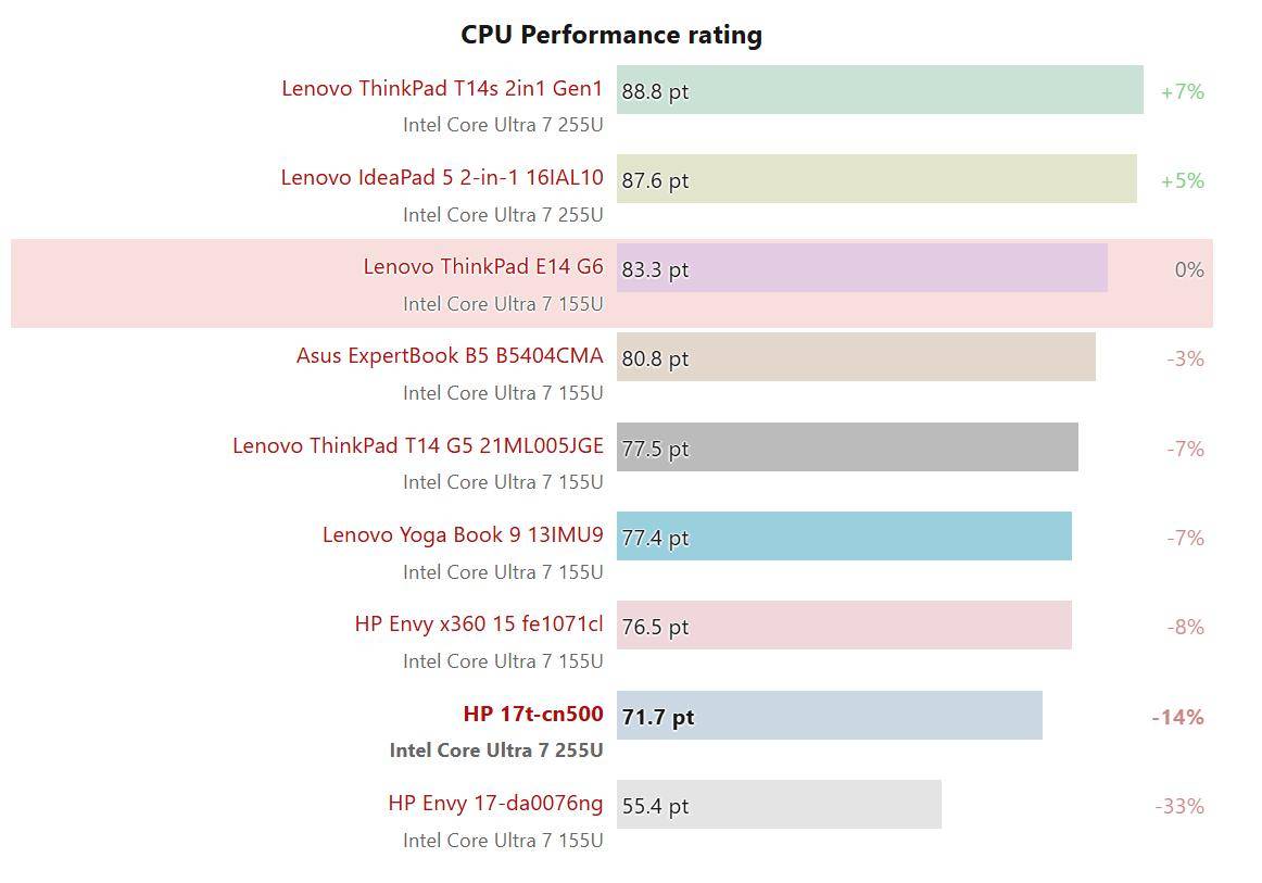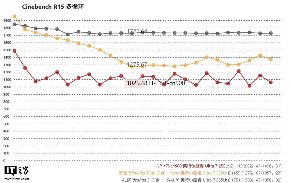 科技媒体 Notebook Check 昨日(11 月 15 日)发布博文,报道称英特尔新款酷睿 Ultra 7 255U 处理器已上市,但相比较上一代 Ultra 7 155U,性能浮动较大,笔记本的散热设计和功耗限制是决定处理器实际性能的关键。 英特尔近期推出的 Arrow Lake-U 架构酷睿 Ultra 7 255U 处理器,作为去年 Meteor Lake-U 架构酷睿 Ultra 7 155U 的继任者,已广泛应用于新款笔记本电脑中。然而,多项实测表明,新款处理器并未带来预期的稳定性能提升,其在不同设备上的表现差异悬殊。 该媒体测试搭载酷睿 Ultra 7 255U 处理器的三款设备,分别为惠普 17t-cn500、联想 ThinkPad T14s 二合一 Gen1、联想 IdeaPad 5 二合一 16IAL10,发现新款处理器并未带来预期的稳定性能提升。 其中,搭载酷睿 Ultra 7 255U 的惠普 HP 17t 笔记本表现最为明显,不仅在同型号处理器的设备中性能垫底,更在压力测试下出现明显的“性能循环”现象。这意味着处理器时钟频率会周期性地剧烈波动,导致在运行游戏或高负载应用时,性能和帧率极不稳定,严重影响用户体验。 IT之家注:性能循环(Performance Cycling)是指处理器在持续高负载下,由于温度或功耗达到上限,其性能(时钟频率)出现周期性的大幅波动,导致应用体验不稳定。 数据显示,酷睿 Ultra 7 255U 的性能表现存在一个巨大的浮动区间。在最佳情况下,例如联想 IdeaPad 5 二合一 16 笔记本中的 255U,其性能可比搭载 155U 的惠普 Envy 17 高出 50%,展现了新架构的潜力。 然而,在最差情况下,例如前述的惠普 HP 17t,其搭载的 255U 性能甚至比联想 ThinkPad E14 G6 中的 155U 还要慢近 20%,出现了“新款不如旧款”的尴尬局面。 这一现象最终揭示了一个核心问题:对于现代移动处理器而言,笔记本电脑本身的散热设计和功耗调校策略,对实际性能的发挥起着决定性作用。处理器的功耗限制(Throttling)行为和散热潜力,已成为比处理器代际名称更值得消费者关注的因素。
