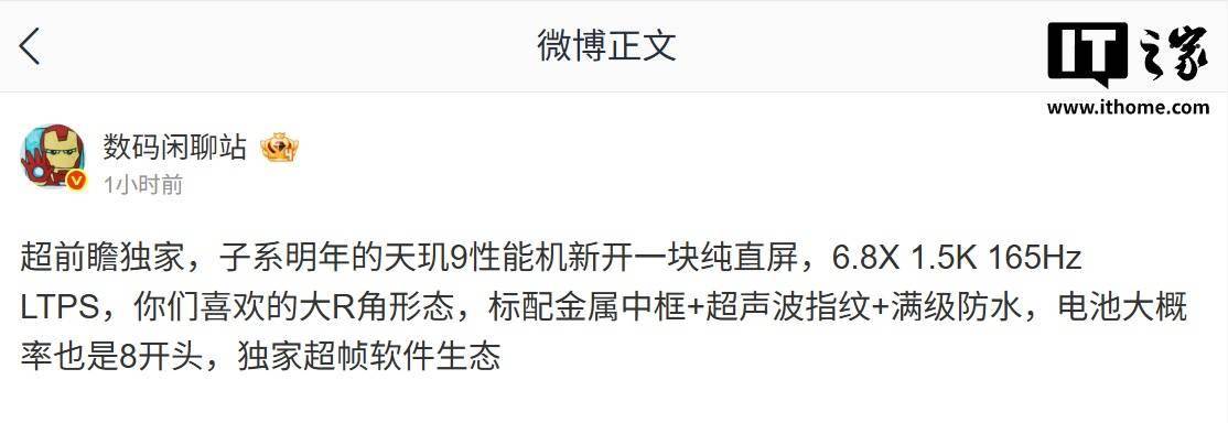 博主表示,这台手机将新开一块纯直屏,参数是 6.8X 英寸、1.5K 分辨率、165Hz LTPS,拥有“你们喜欢的大 R 角形态”,标配金属中框、超声波屏下指纹识别、满级防水,电池大概率也是“8 开头”,拥有独家超帧软件生态。