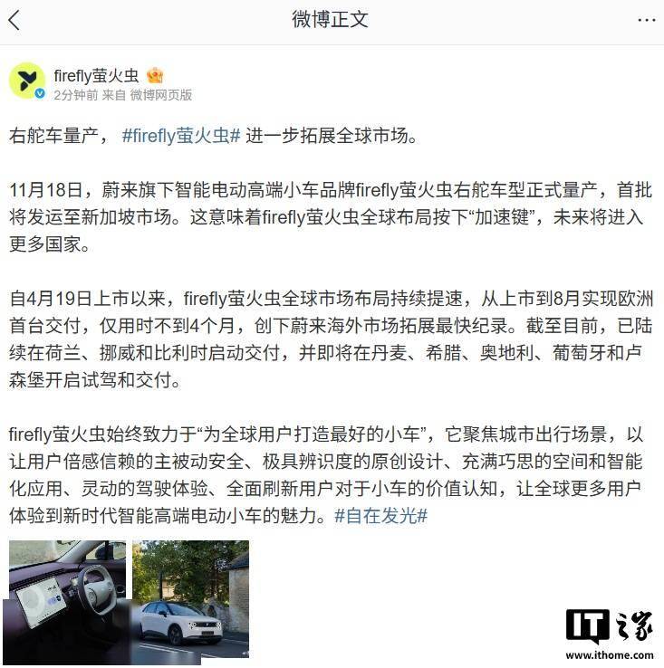 蔚来今日宣布,旗下智能电动高端小车品牌 firefly 萤火虫右舵车型正式量产,首批将发运至新加坡市场。这意味着 firefly 萤火虫全球布局按下“加速键”,未来将进入更多国家。