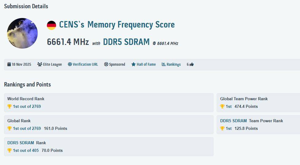 科技媒体 Wccftech 昨日(11 月 18 日)发布博文,报道称 DDR5 内存超频世界纪录再次被刷新,德国超跑专家 CENS 创造了 13322 MT/s,相比较此前纪录(13211 MT/s)超出 111 MT/s。 IT之家查询公开资料,附上 11 月 DDR5 内存超频世界纪录如下: 日期超频用户超频纪录11 月 3 日Hicookie13034 MT/s11 月 4 日Saltycroissant13153 MT/s11 月 8 日AiMax13211 MT/s11 月 18 日CENS13322 MT/s 德国超频玩家“CENS”本次使用的配置为英特尔酷睿 Ultra 9 285K 处理器、华硕 ROG Maximus Z890 APEX 主板以及 G.SkillTrident Z5 24GB DDR5 内存条。 大多数世界纪录都是使用技嘉 Z890 AORUS Tachyon ICE 主板创造的,但 Z890 APEX 也毫不逊色。这款主板帮助 CENS 实现了惊人的 6661.4 MHz 或 13322.8 MT/s 的内存频率,速度提升了近 111 MHz 。 内存频率也通过 CPU-Z 进行了验证,时序为 CL68-127-127-127-2,这位超频玩家分享了一张他的配置照片,照片显示 CPU 和内存都采用了液氮冷却。
