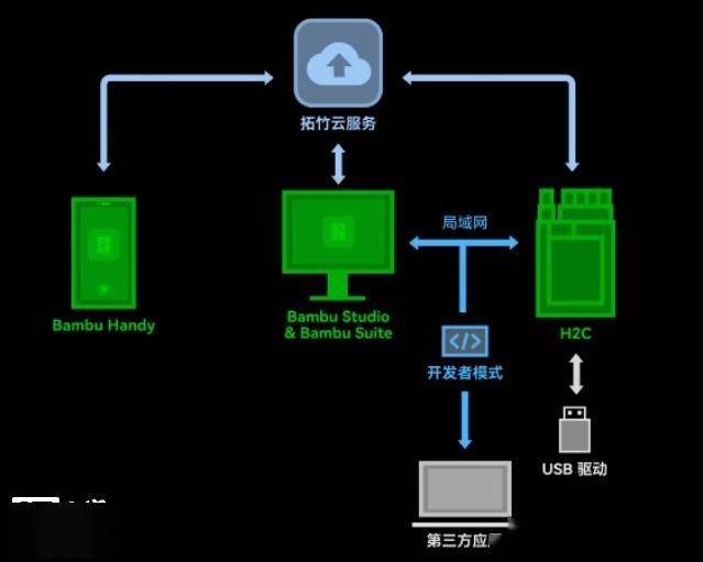 支持云端连接的同时,H2C 也支持本地局域网模式和物理连接操作。用户可以在不连接因特网的情况下控制打印机、发送切片、更新固件。对于喜欢捣鼓的用户,开发者模式也让用户可用第三方配件和软件通过 MQTT 连接和操控打印机。
